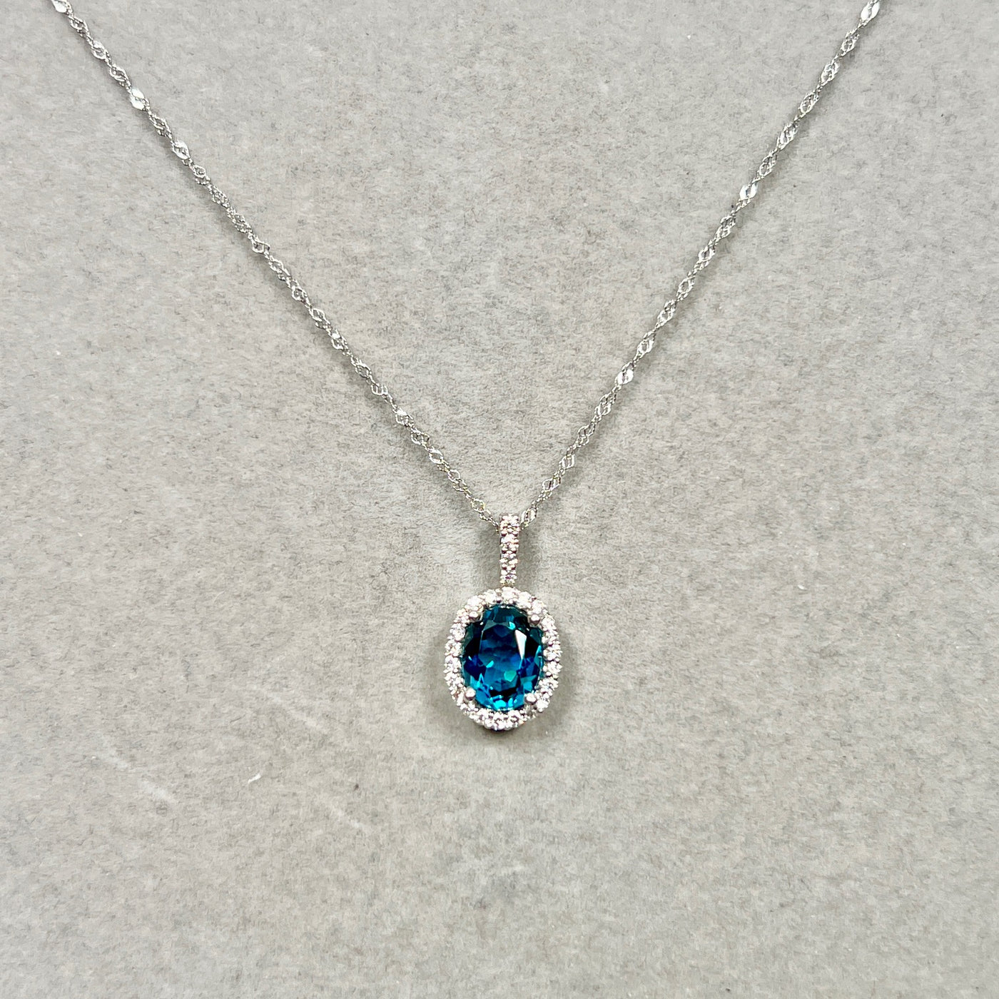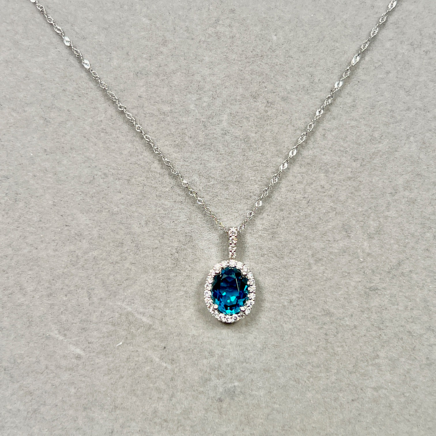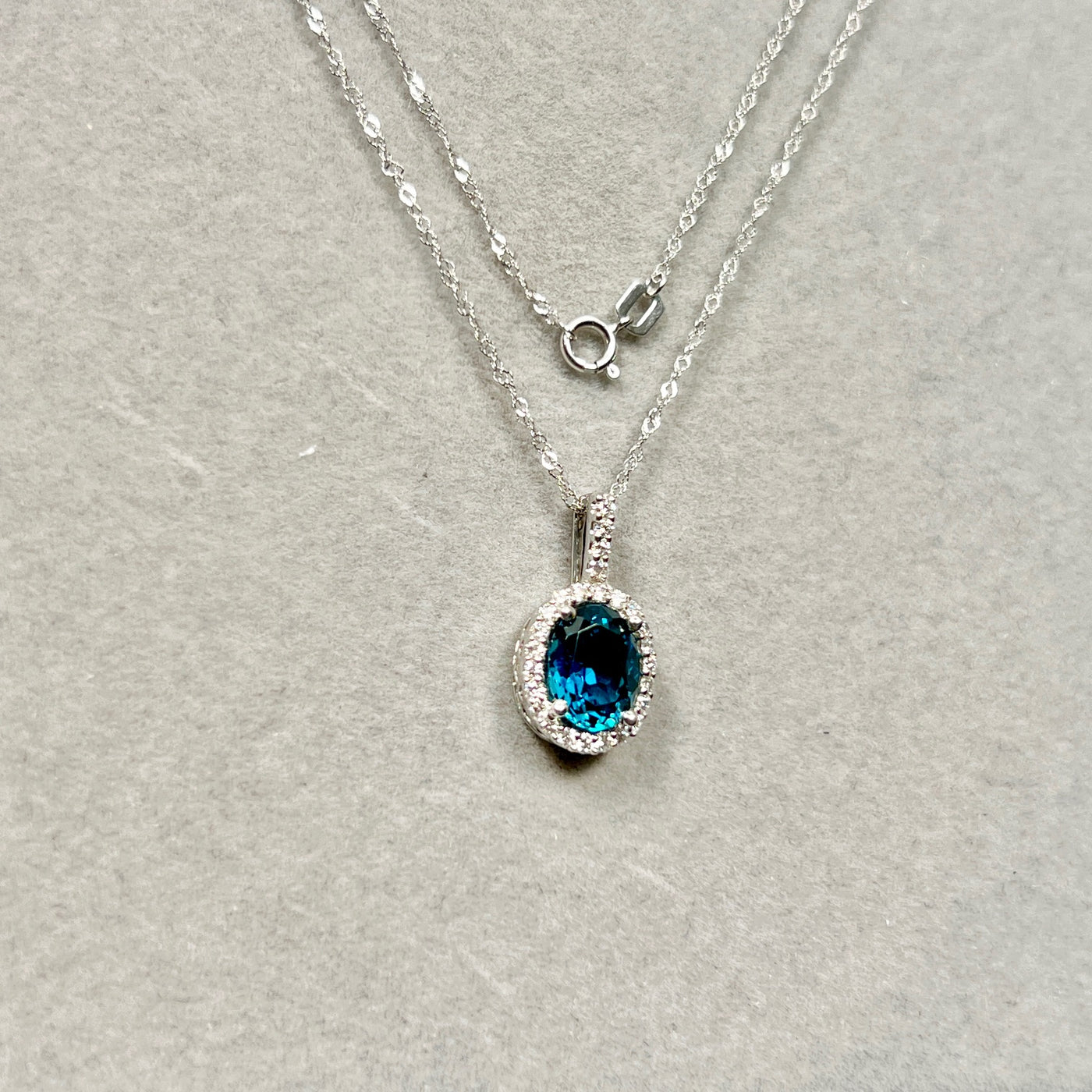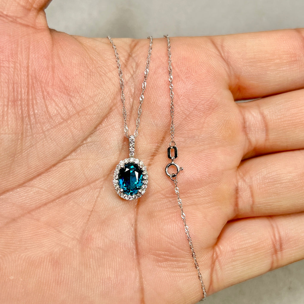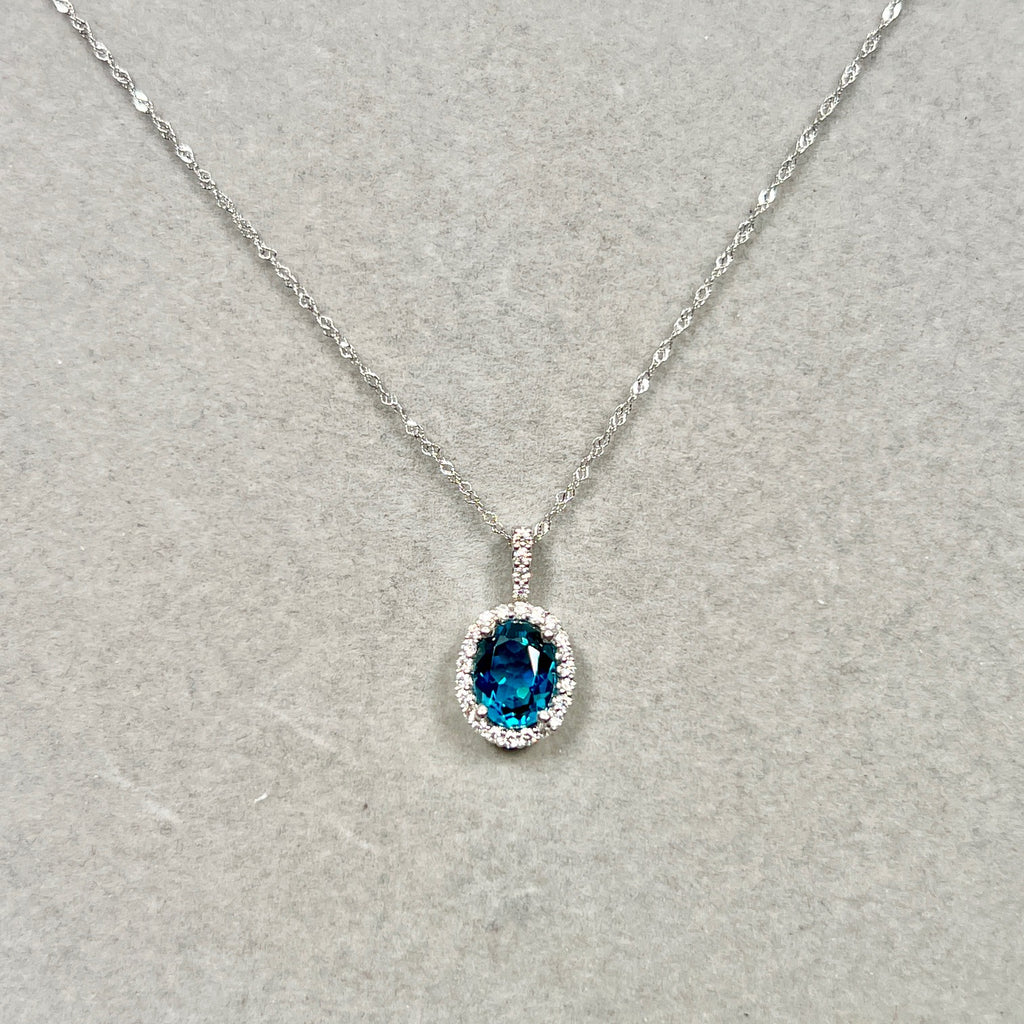 Make a striking statement with this elegant London Blue Topaz & Diamond Pendant, expertly crafted in solid 14K White Gold. The pendant showcases an AAA quality oval-shaped London Blue Topaz with a rich, deep blue hue, beautifully accented by twenty-one sparkling round diamonds in a secure prong setting.