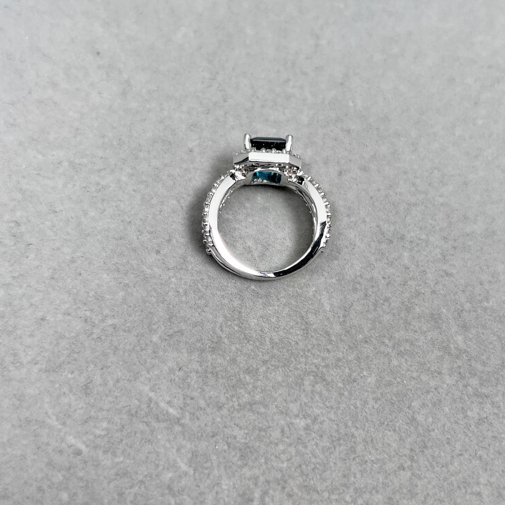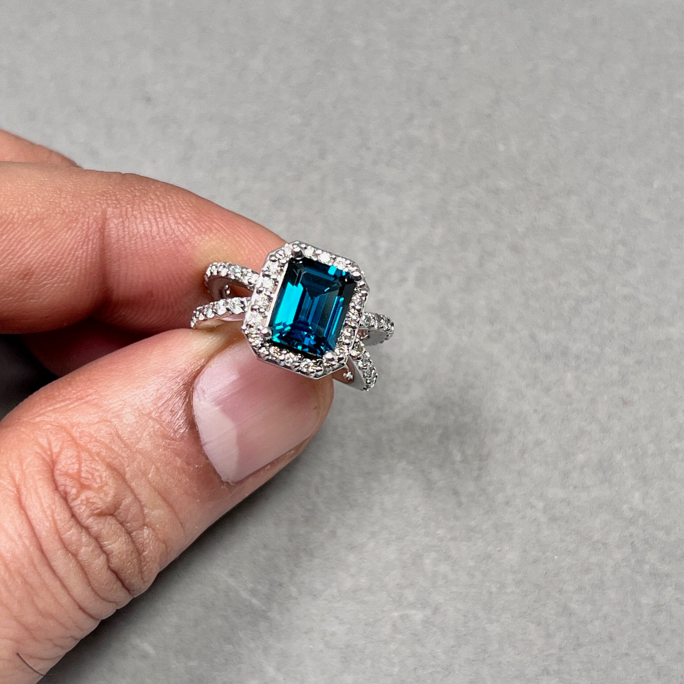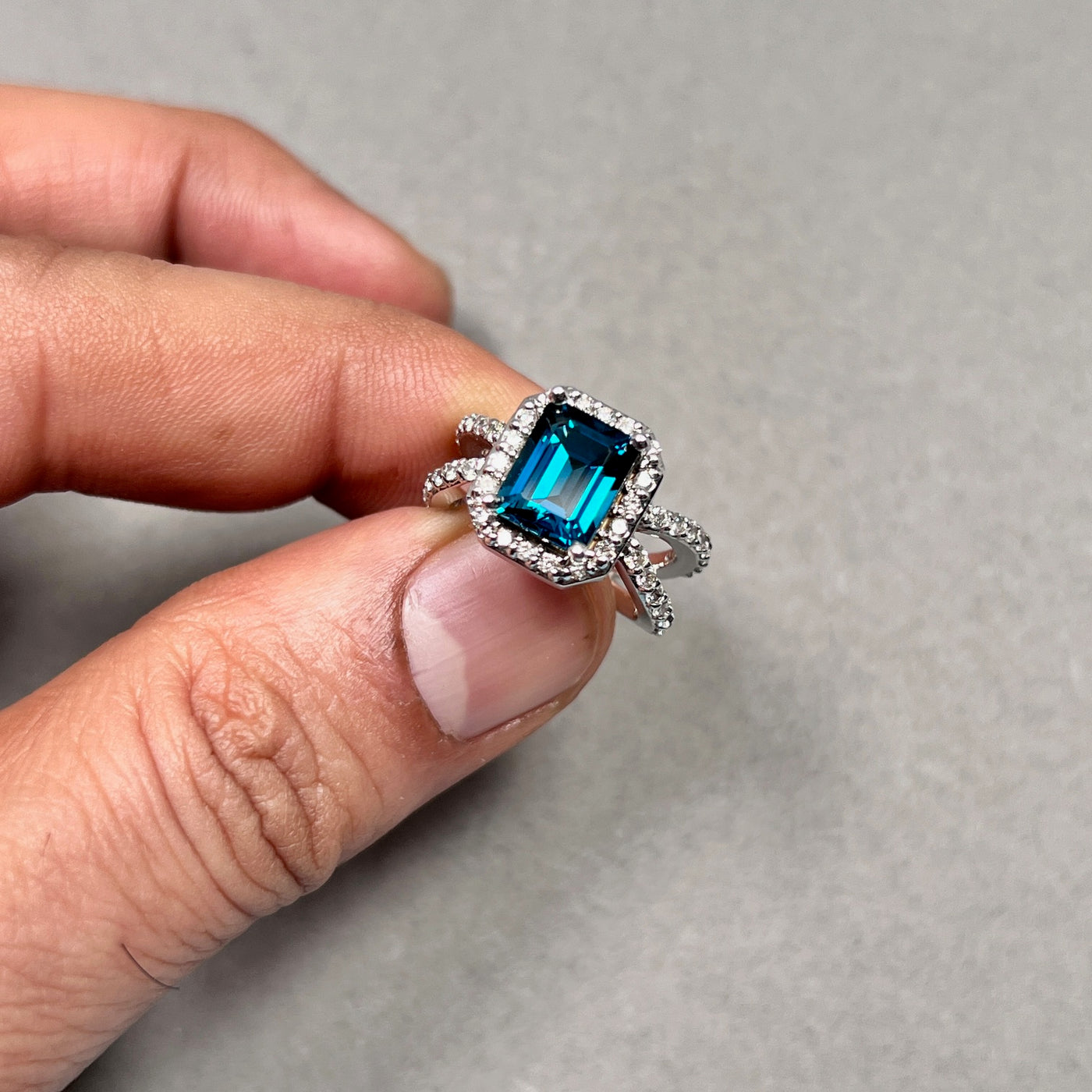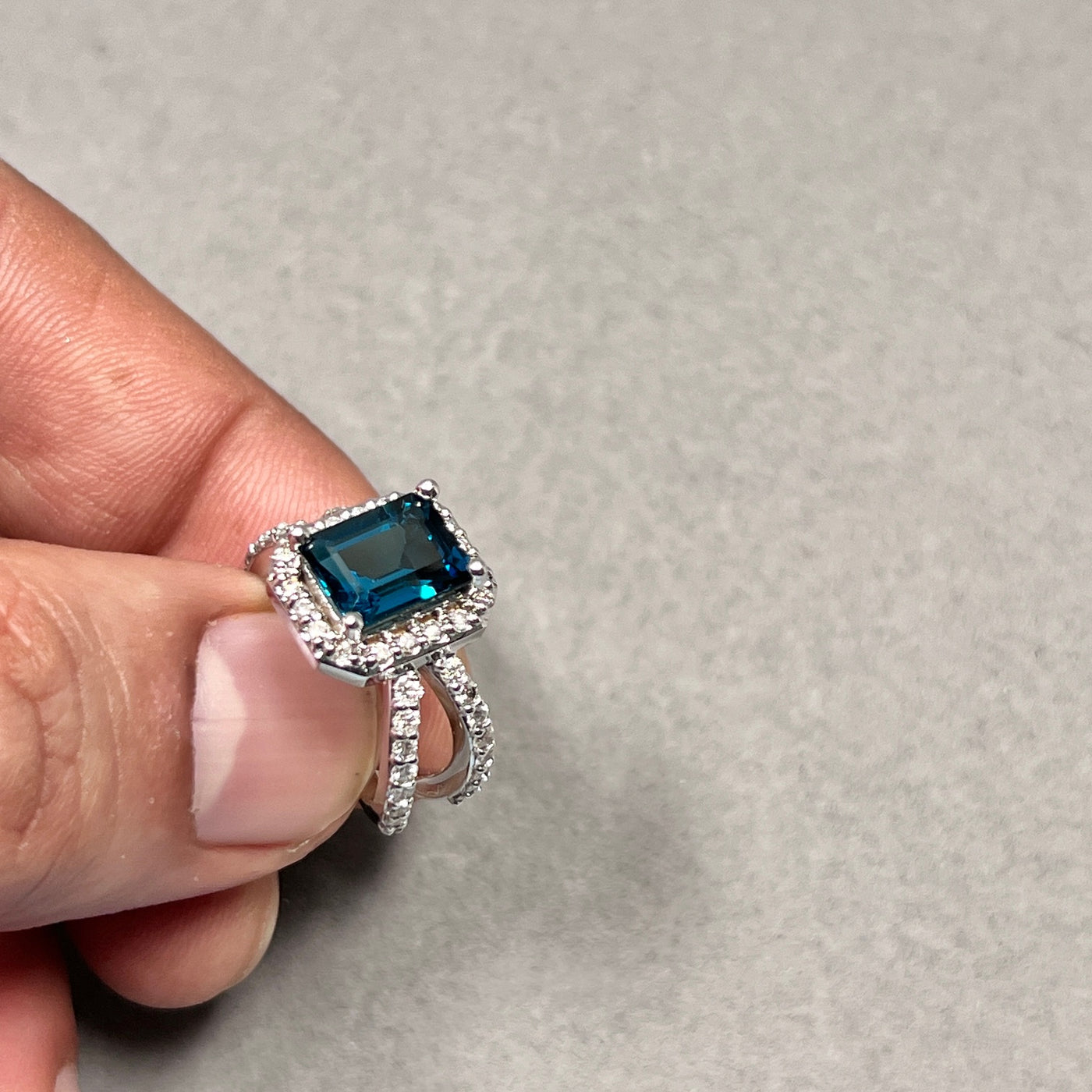 “emerald cut London Blue Topaz engagement ring”, “AAA quality blue topaz diamond ring”, “fine gemstone ring in 14k white gold”, “women’s natural topaz and diamond jewelry”