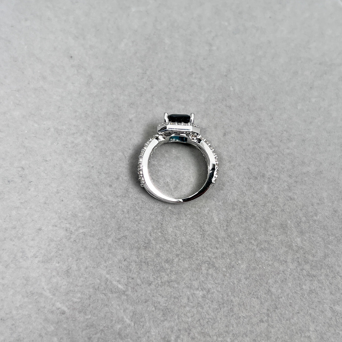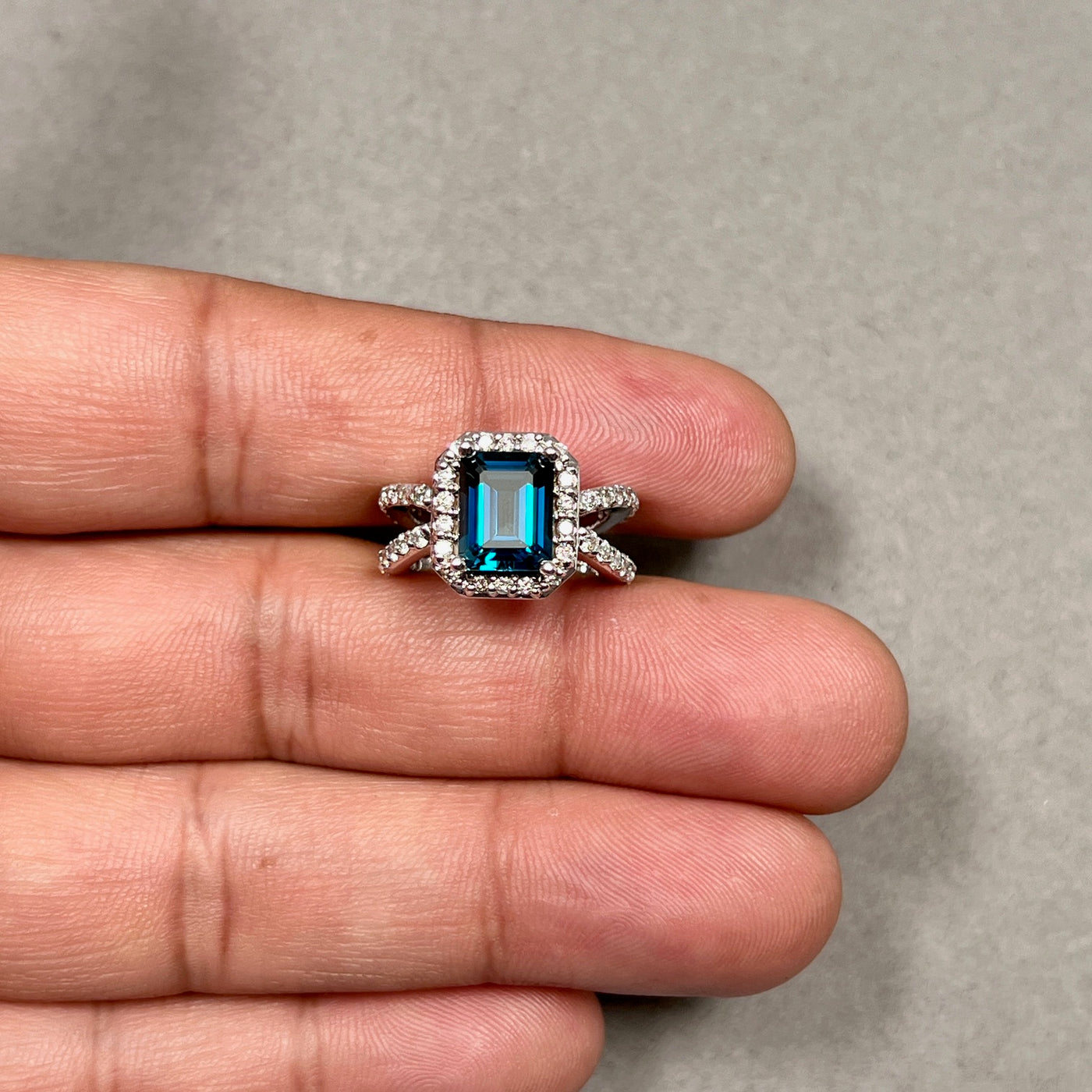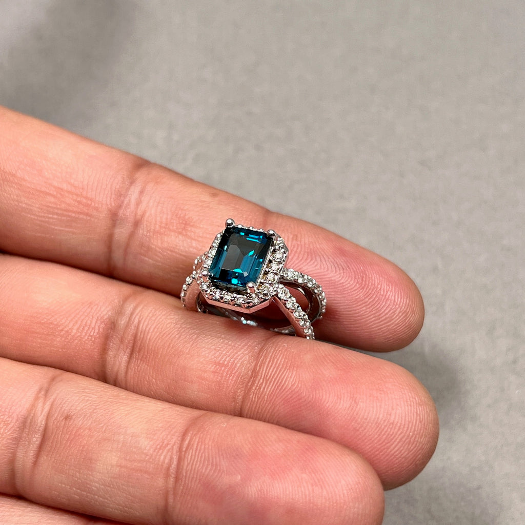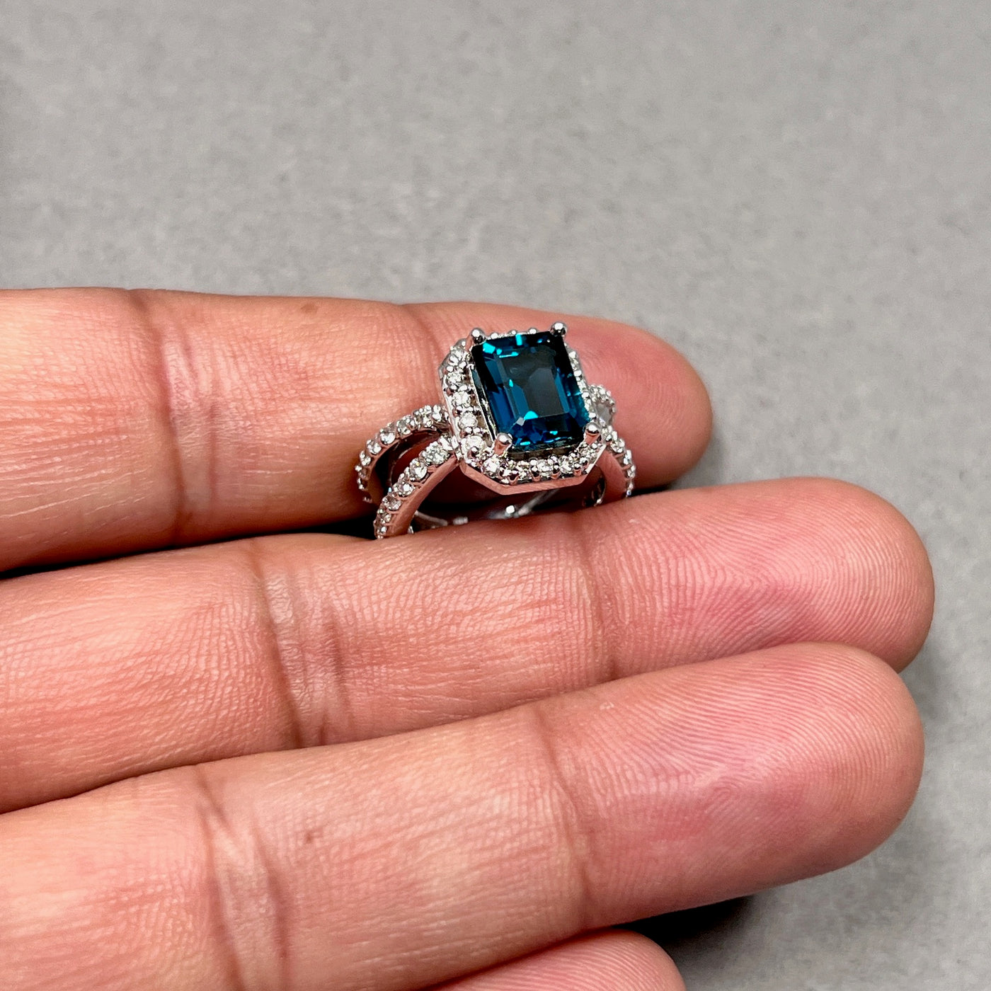 Experience timeless sophistication with this 0.70 Ct Diamond & 2.55–3.46 Ct 9x7mm AAA Emerald-Cut London Blue Topaz Ring in 14K White Gold. The deep teal hue of the natural London Blue Topaz—expertly emerald-cut for maximum brilliance—is beautifully framed by 50 sparkling white diamonds in a secure prong setting. The high-polished rhodium-finished 14K white gold band adds a refined elegance, making this ring a captivating choice for fine jewelry collectors, engagement ring seekers, and lovers of unique natural gemstones.