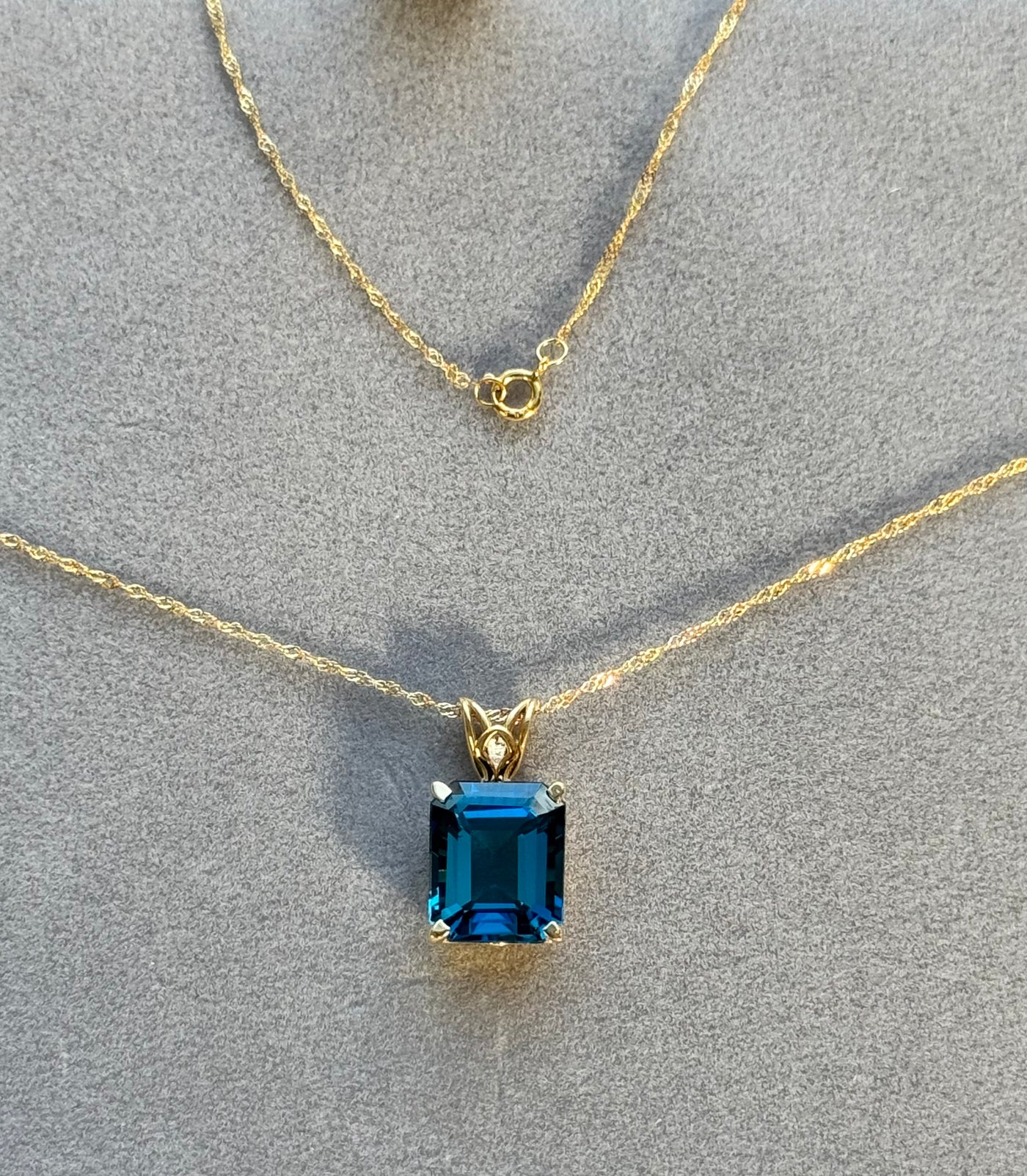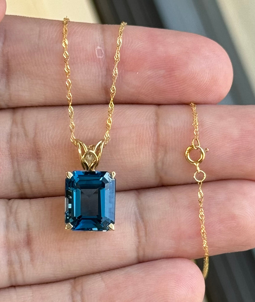 London Blue Topaz Pendant 14K Yellow Gold • 12x10mm Emerald Cut Solitaire Necklace • AAA Gemstone Scroll Design 6.59-7.99 Cts