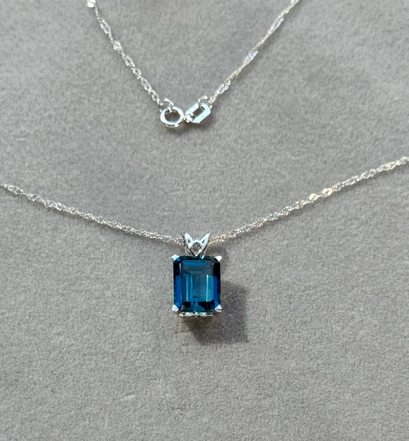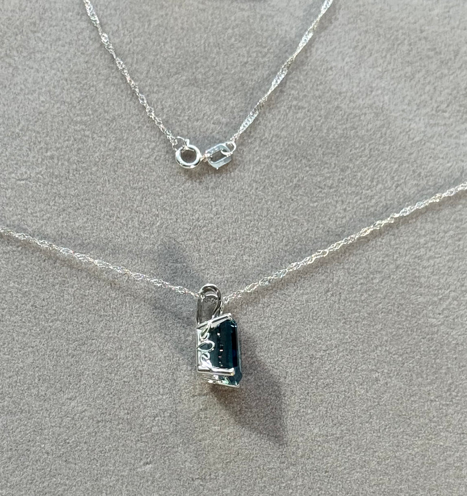 London Blue Topaz Pendant 18K White Gold • 9x7mm Emerald Cut Solitaire Necklace • AAA Gemstone Scroll Design 2.23 Cts