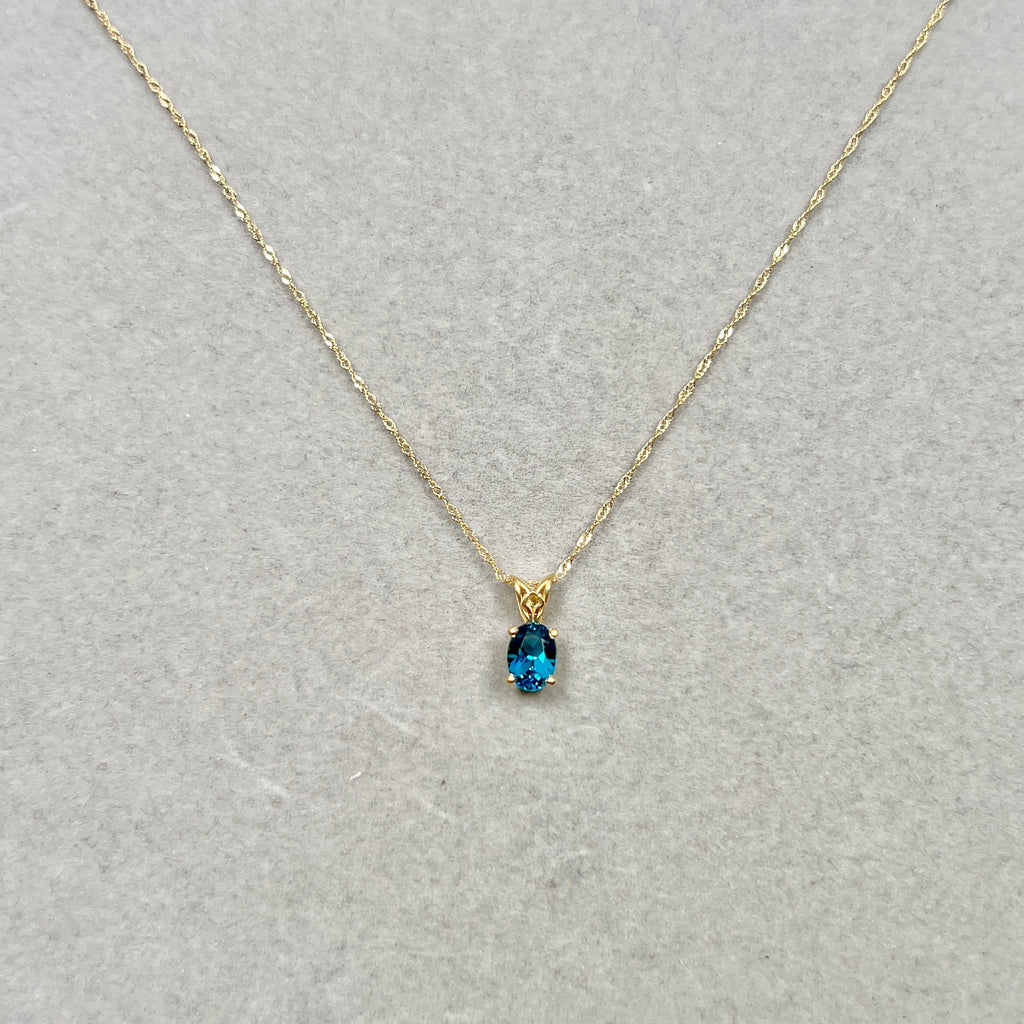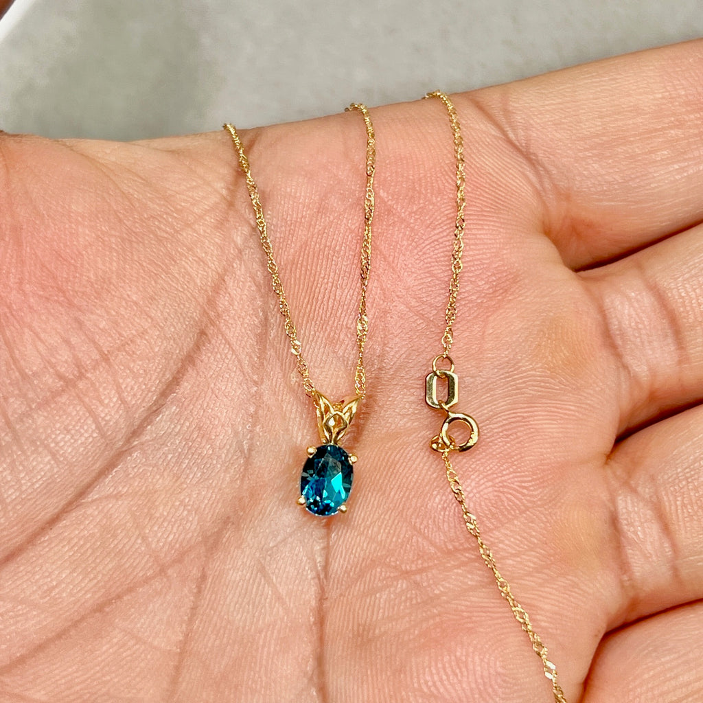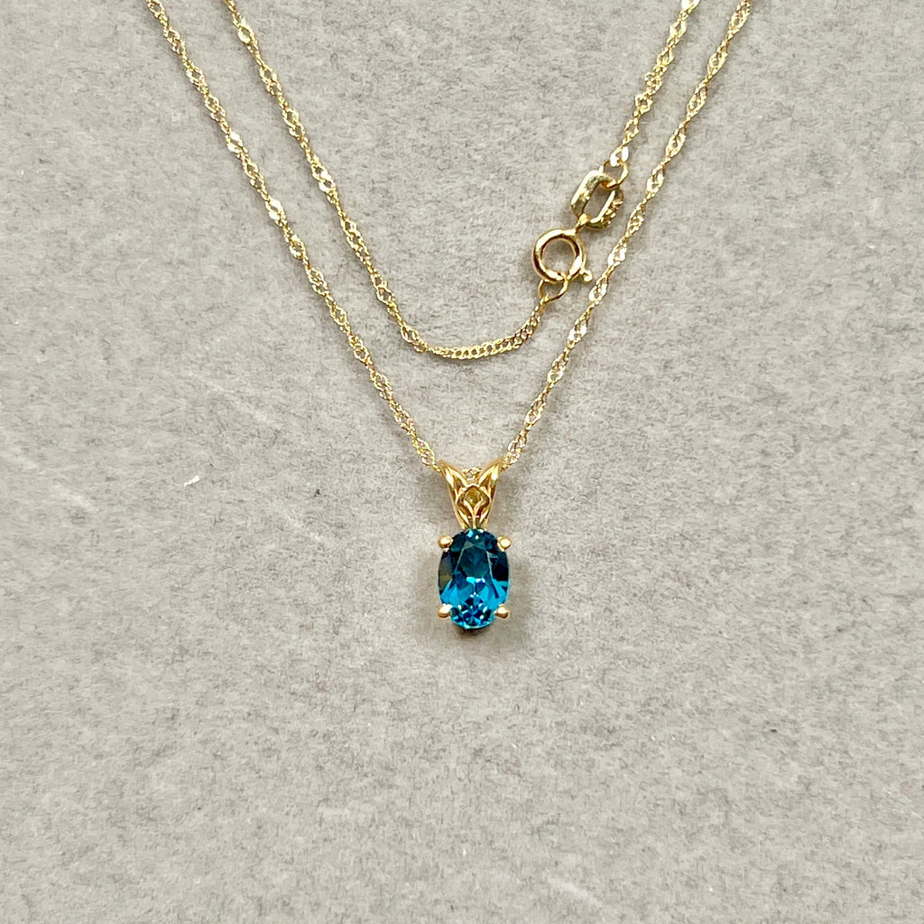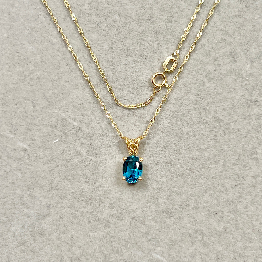 London Blue Topaz Scroll Pendant 0.81 Ct | 18K Yellow Gold Oval Topaz Necklace | AAA Dark Blue Topaz Pendant with Chain