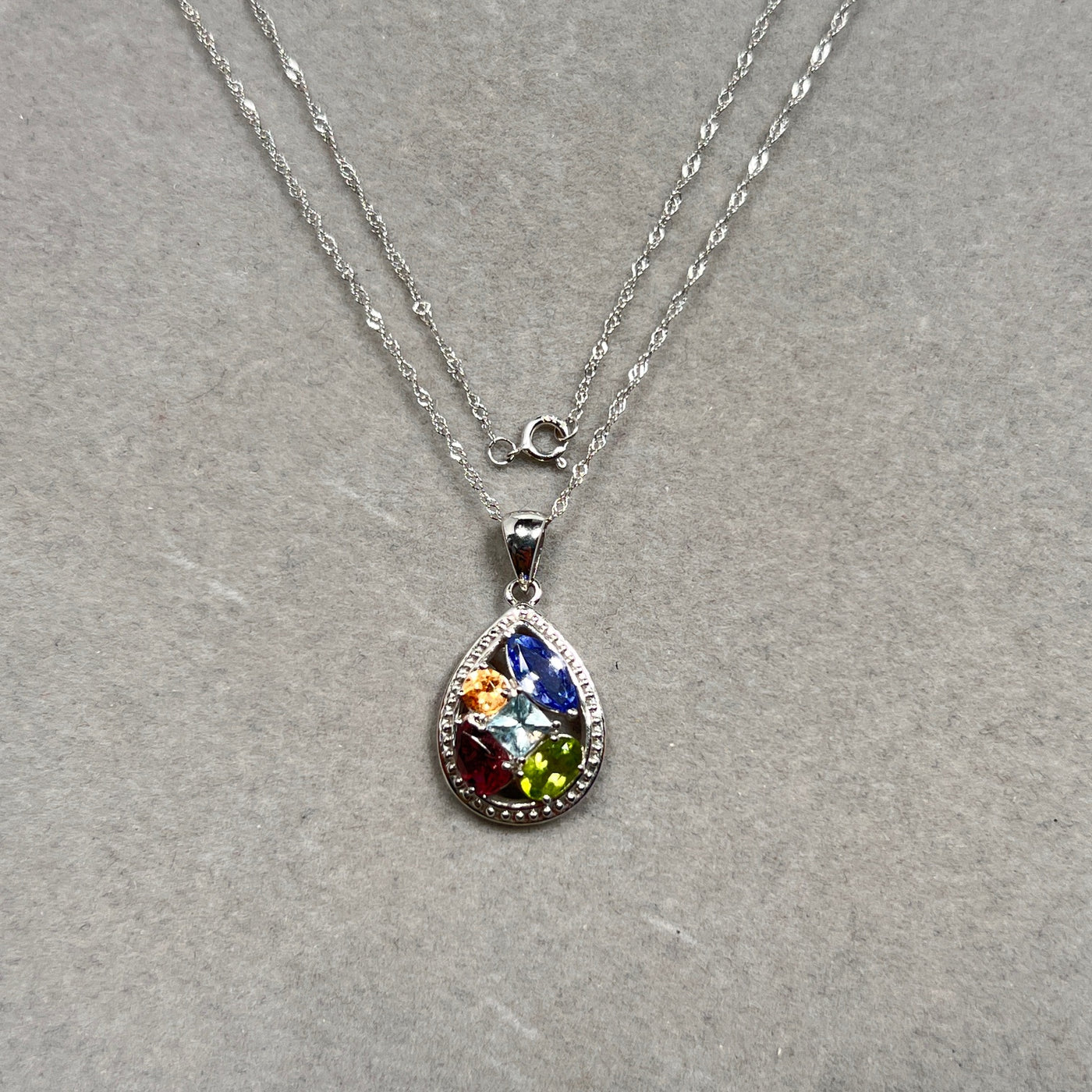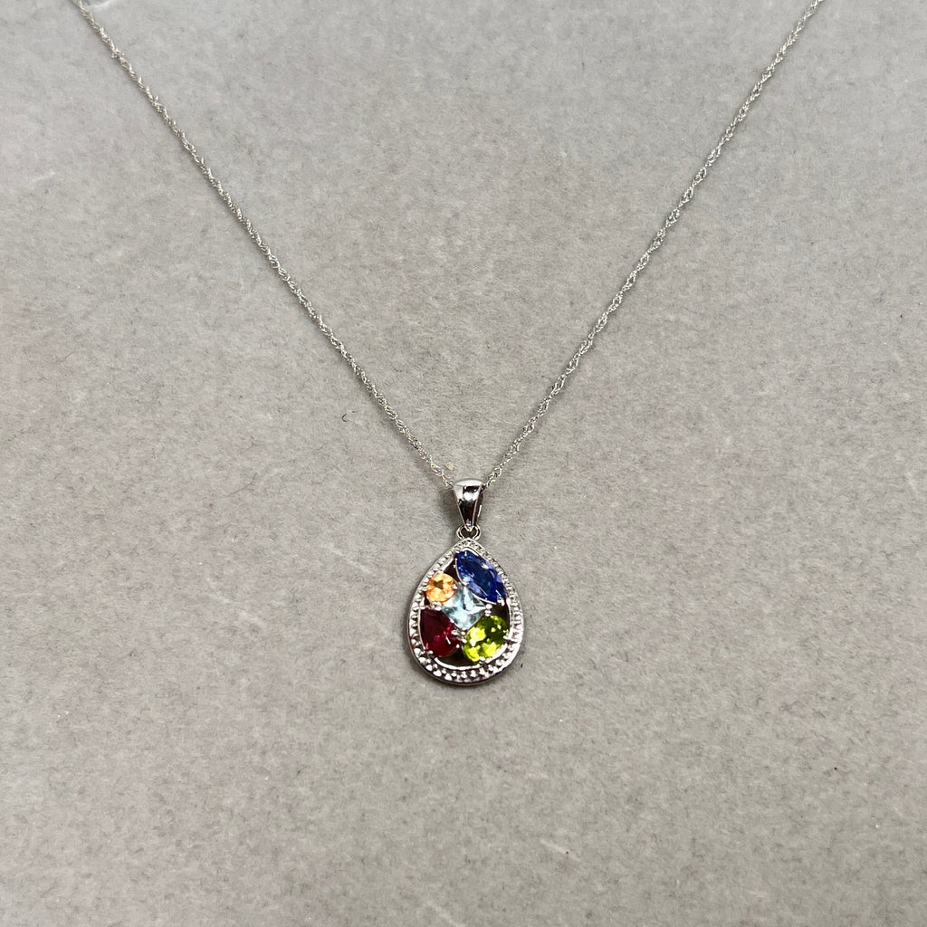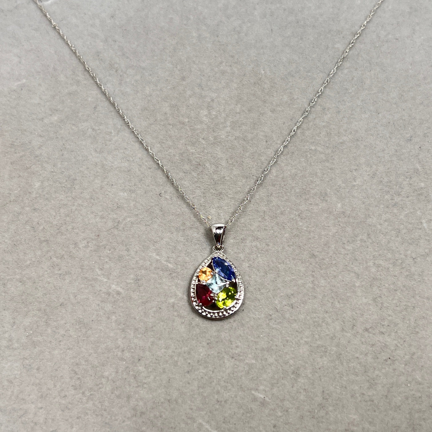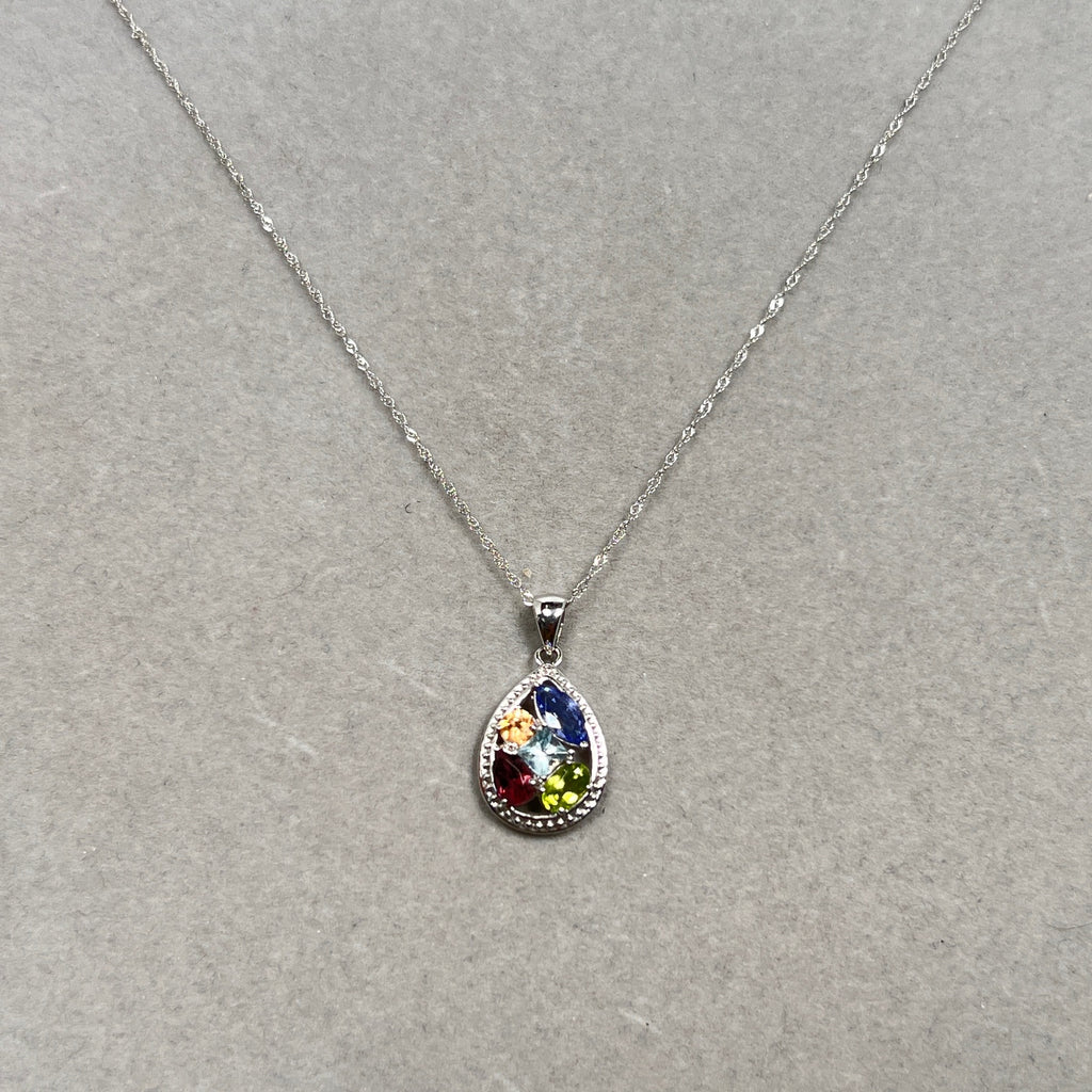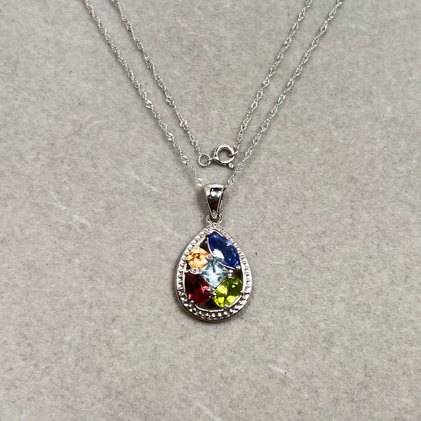 This ultra-gorgeous multi-gemstone pendant is exquisitely crafted in 14K White Gold and showcases a vibrant array of premium gemstones. The pendant features an oval Peridot (0.50 Ct), a round Mandarin Garnet (0.33 Ct), a princess-cut Aquamarine (0.25 Ct), a marquise Tanzanite (0.22 Ct), and a pear-shaped Pink Tourmaline (0.35 Ct). Each gemstone brings its own unique color and brilliance, creating a stunning rainbow-inspired design. Finished with an 18-inch 14K White Gold Singapore Chain, this pendant delivers elegance, color, and luxury in one breathtaking piece.