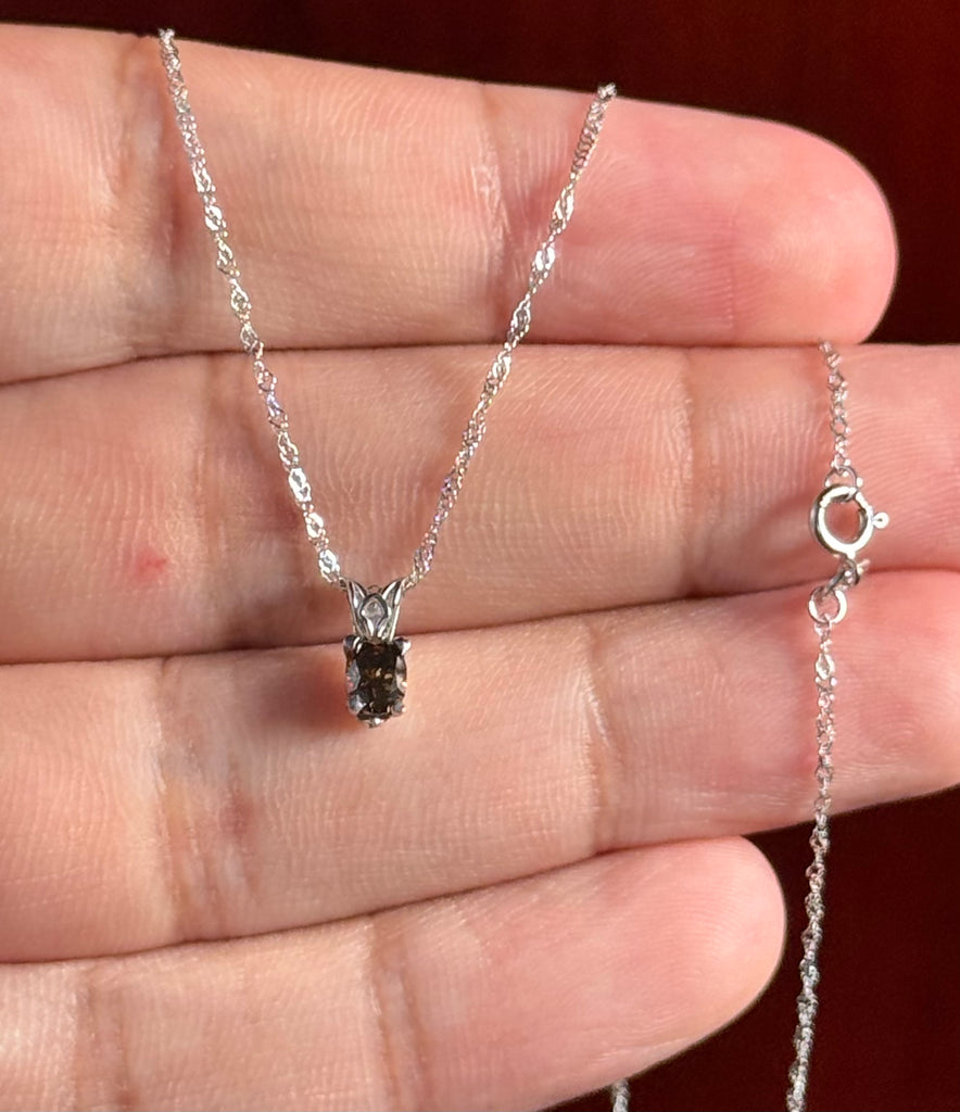 Rich, warm, and irresistibly unique, this Natural Fancy Dark Orangey‑Brown Diamond pendant is a sophisticated twist on the classic solitaire. The oval‑shaped diamond (approx. 4.9 × 3.6 × 2.6 mm; ~0.33 carats) is graded SI1 for clarity, ensuring a beautiful balance of sparkle and natural character. Its deep golden‑cognac tone reflects a rare and captivating beauty, making it perfect for collectors and style connoisseurs alike.