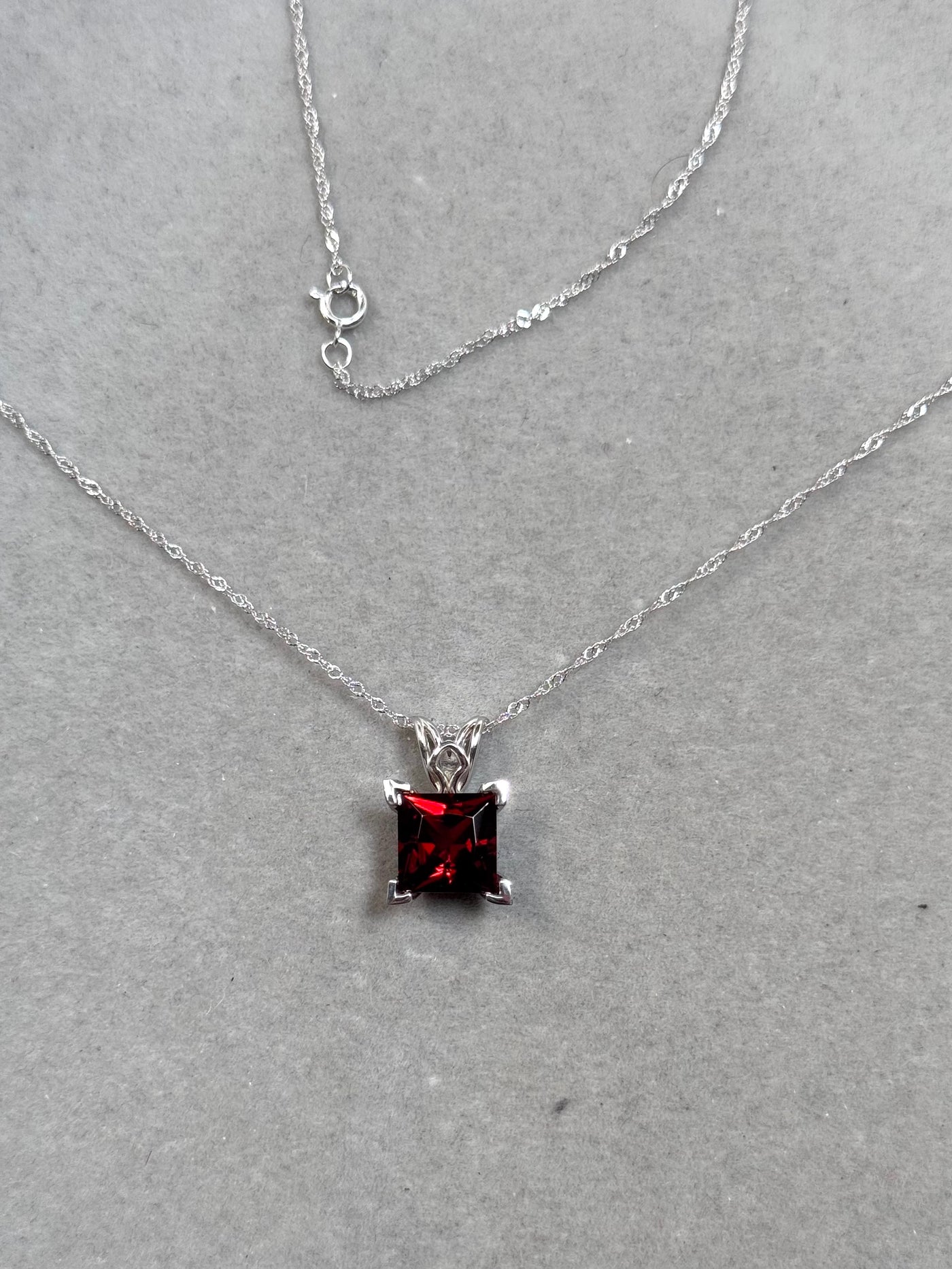 This elegant Natural Garnet Scroll Pendant features an AAA quality princess-cut garnet solitaire weighing approximately 2.35–2.90 carats, beautifully prong set in solid 14K white gold. The graceful scroll design adds refined detail while allowing the rich red garnet to remain the focal point, offering timeless sophistication.