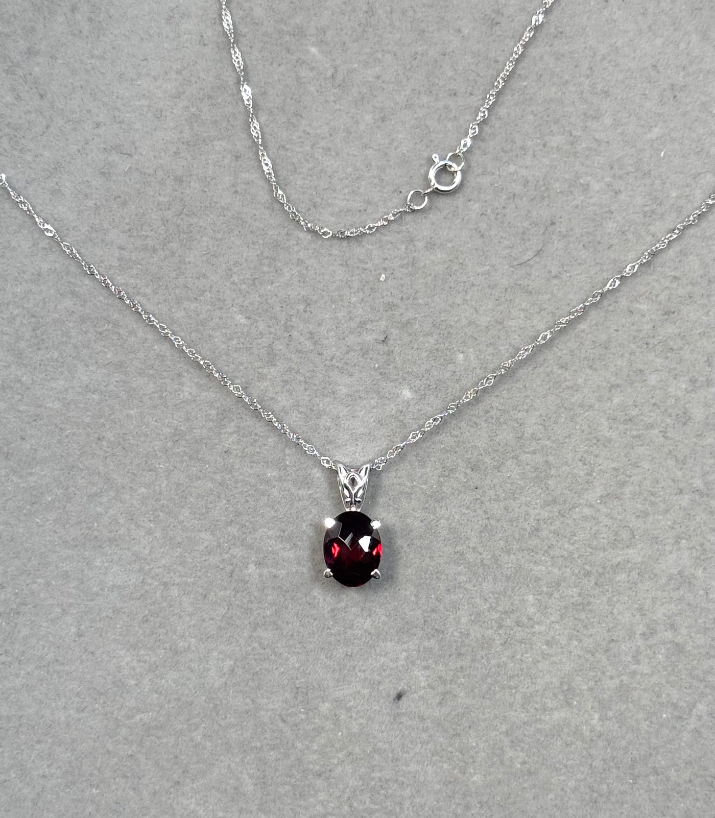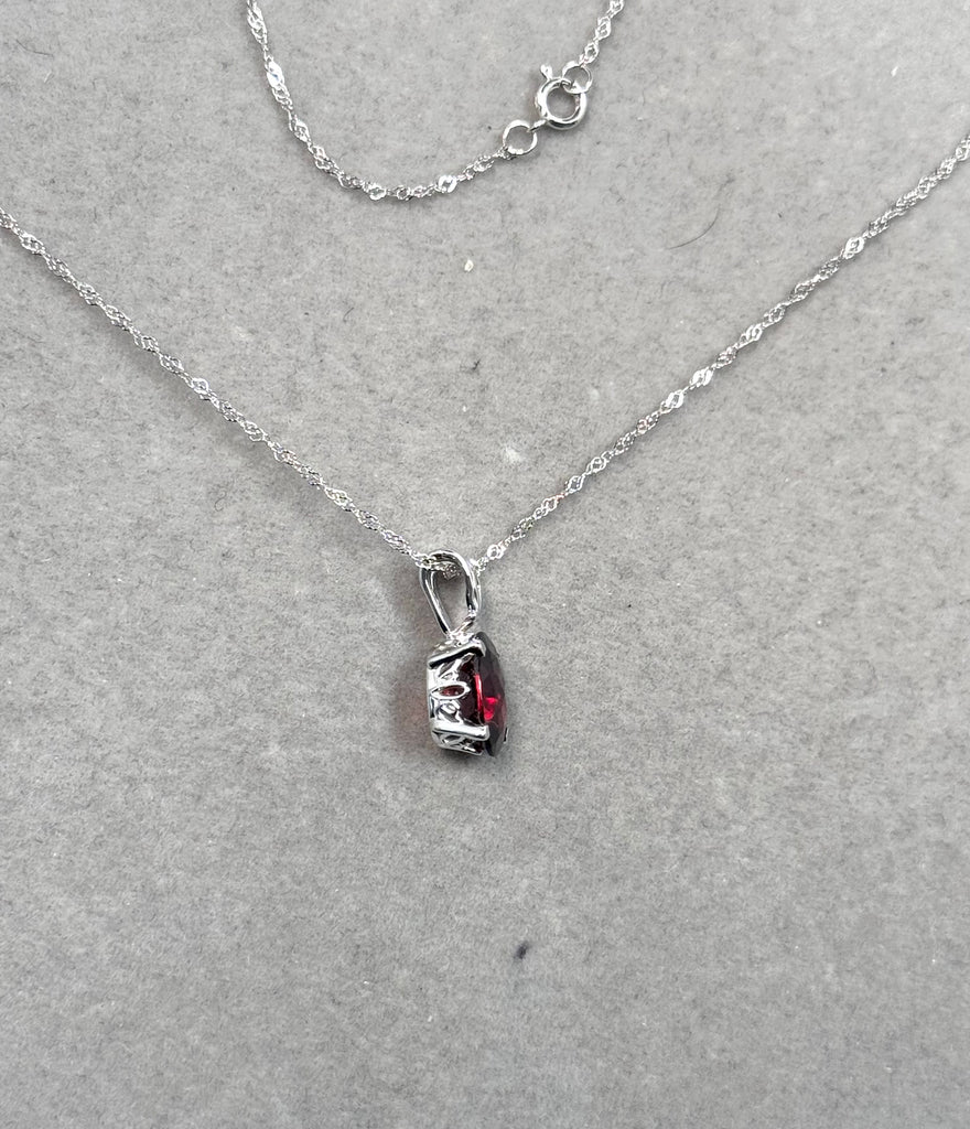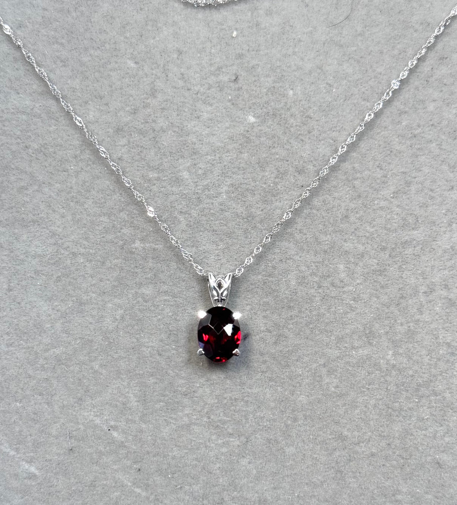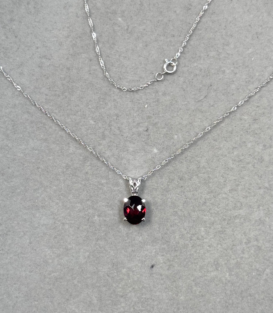 Oval Garnet Scroll Pendant 14K White Gold | AAA Checkered Garnet 2.00–2.85 Cts | Red Gemstone Pendant with 18 Inch Chain