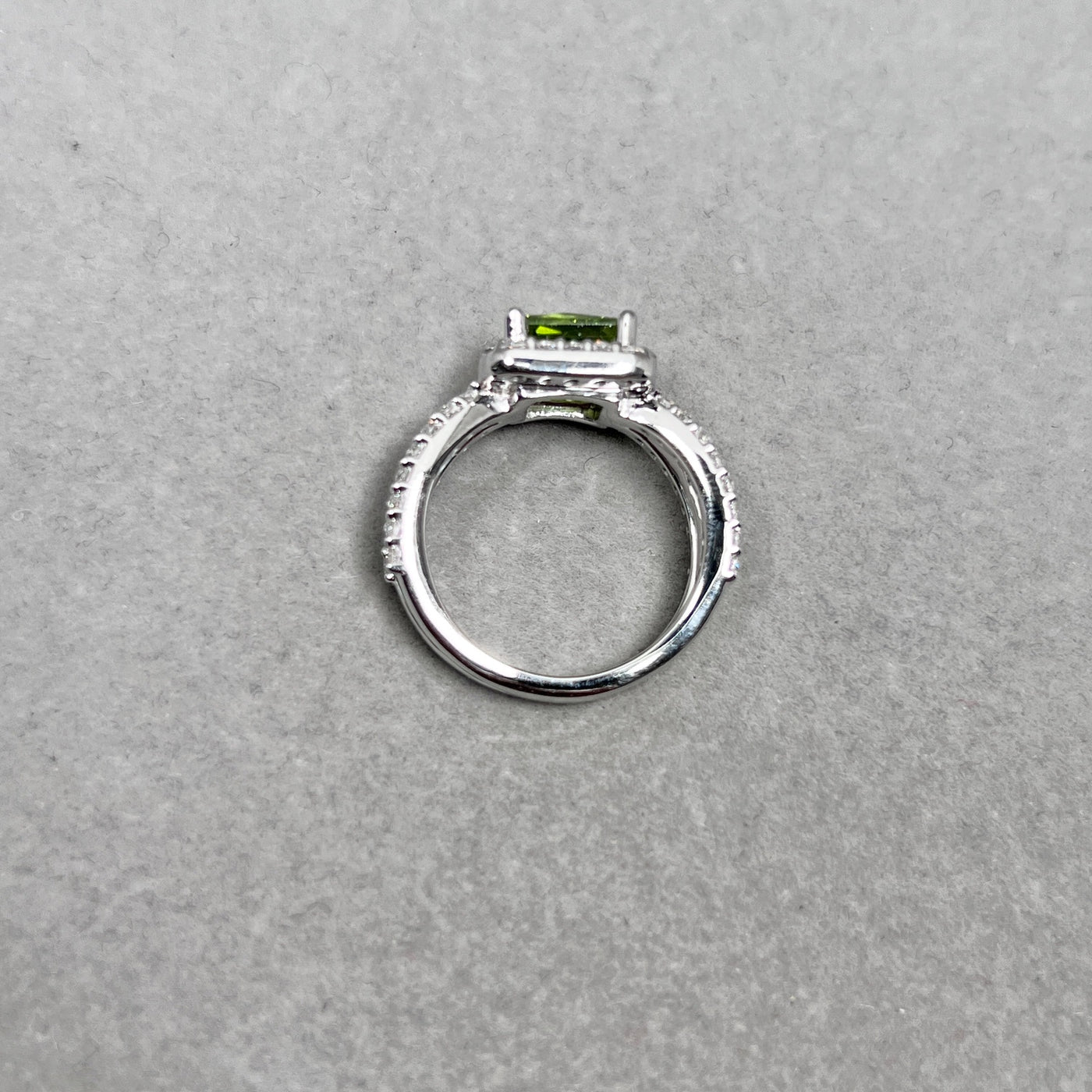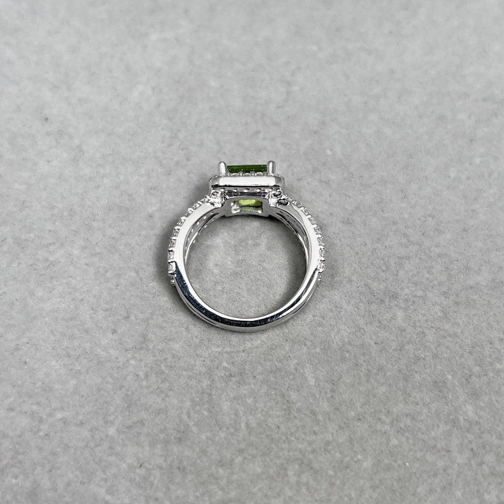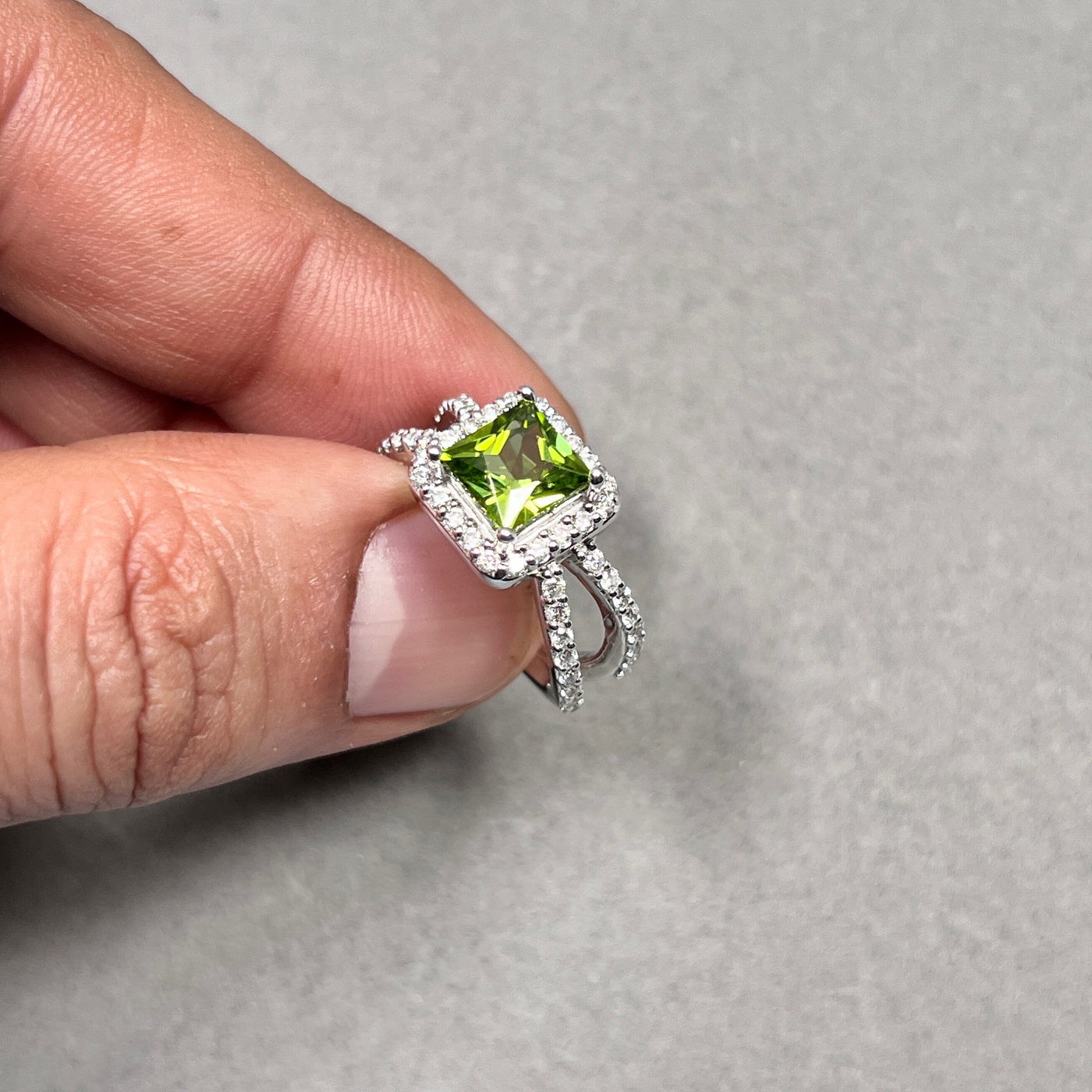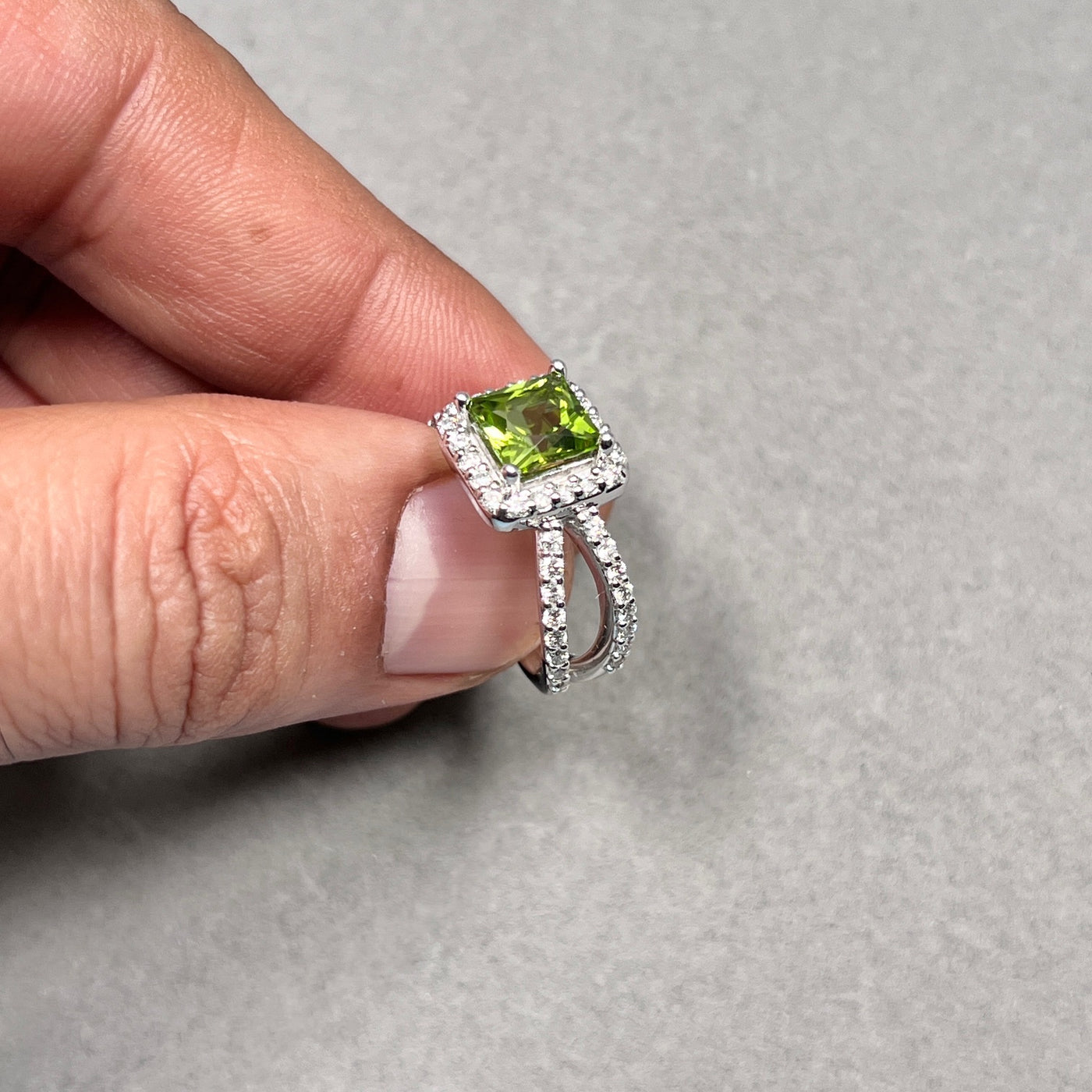 Peridot Princess Cut Ring 7mm in 14K White Gold | 1.56 CT Gemstone with 3/4 CT H SI Diamonds | Womens Fine Jewelry Gift