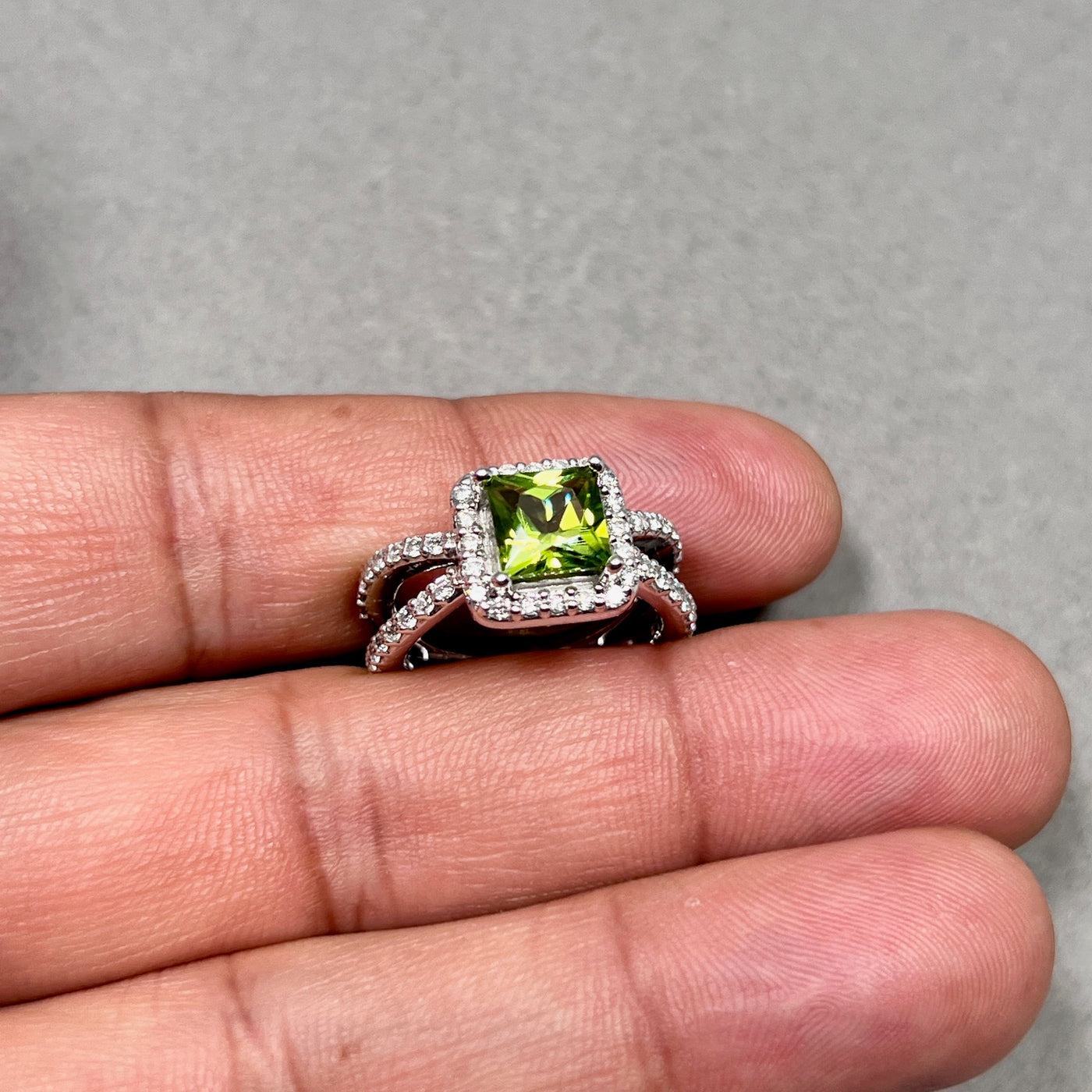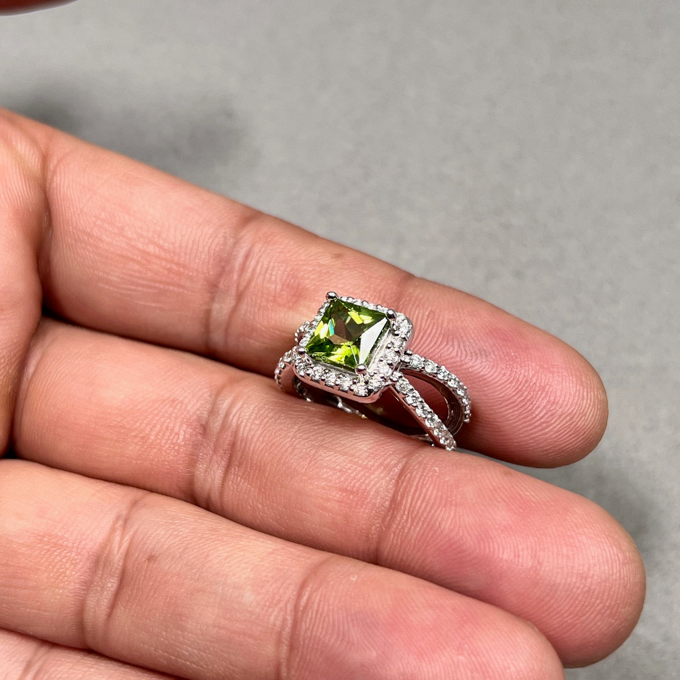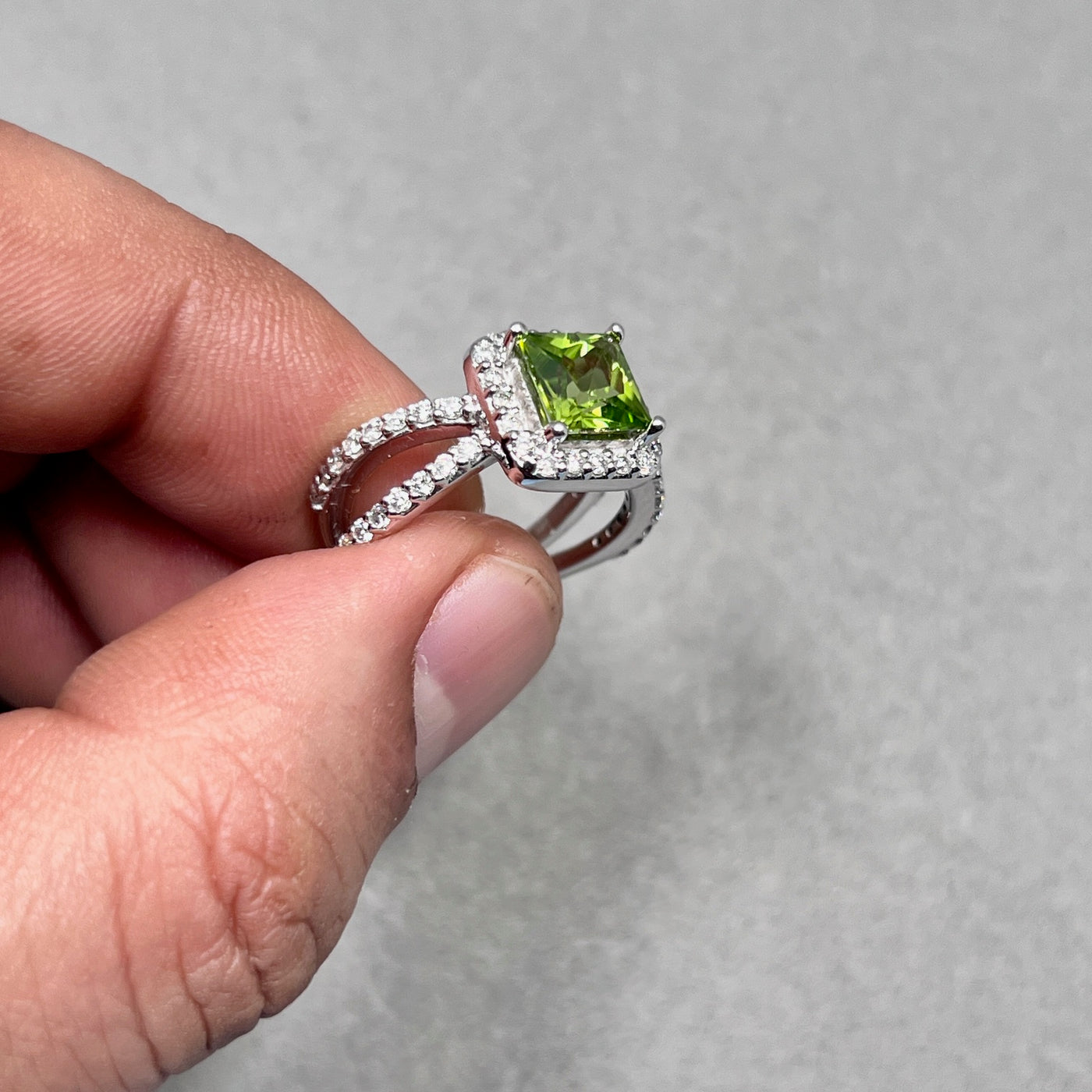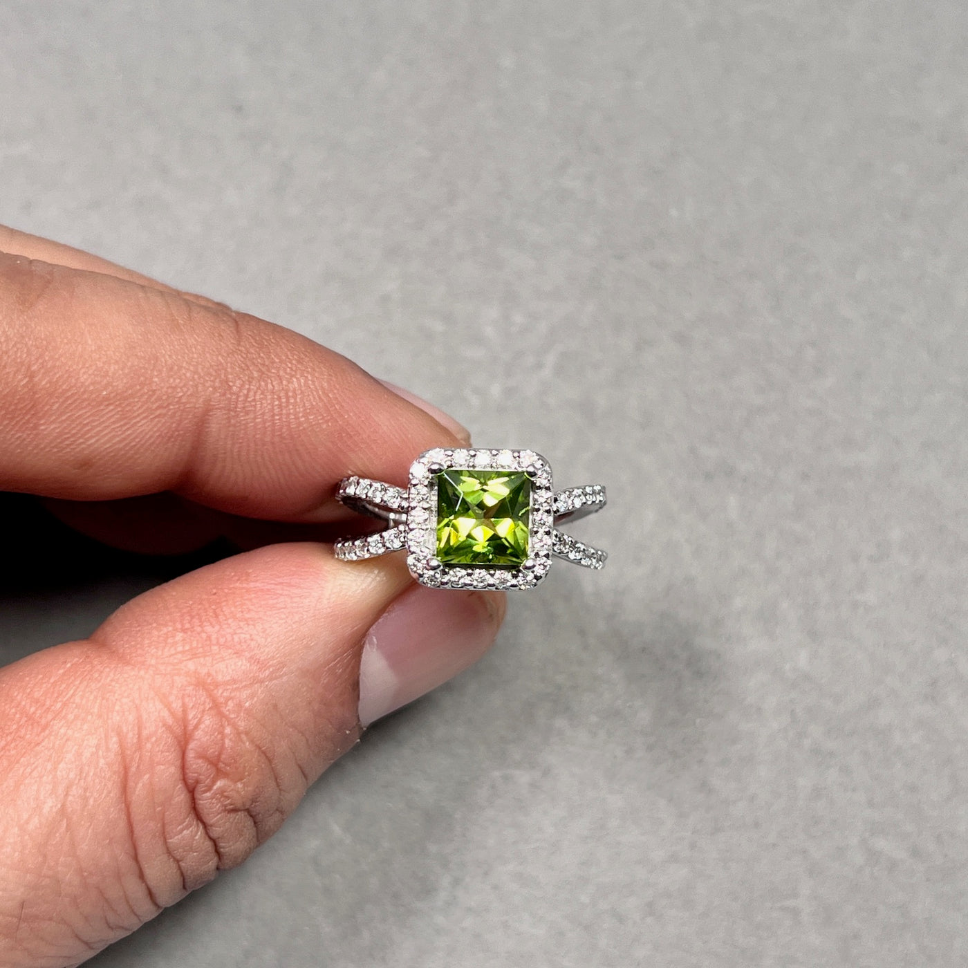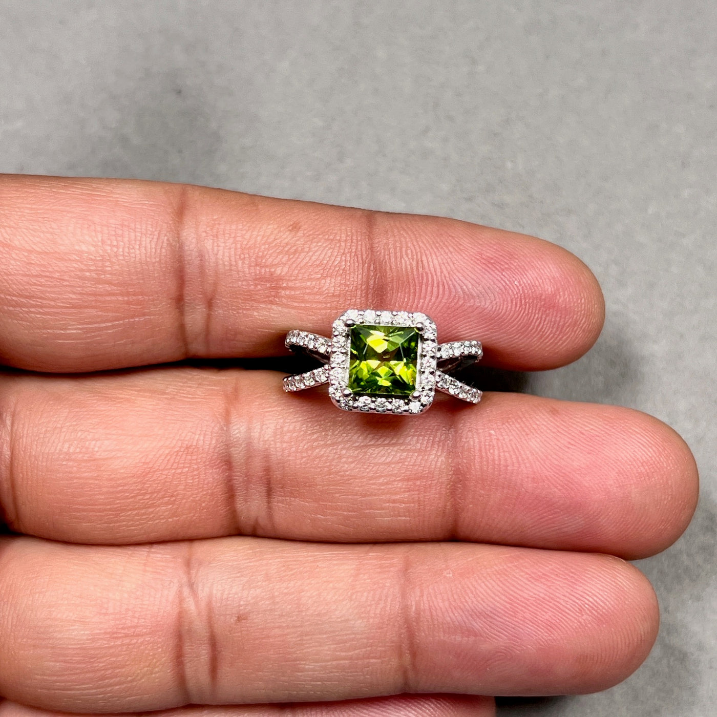 This stunning AAA Princess Cut Peridot Ring in 14K White Gold features a brilliant 7mm natural peridot weighing 1.56 carats, complemented by 52 sparkling round diamonds totaling approximately 0.76 carats (3/4 CT). With its vibrant green hue and radiant diamond accents, this ring captures elegance and luxury — perfect for women who appreciate refined gemstone jewelry with luminous presence. Crafted in solid 14K white gold with rhodium finish, this piece is a statement of style, sophistication, and timeless beauty.