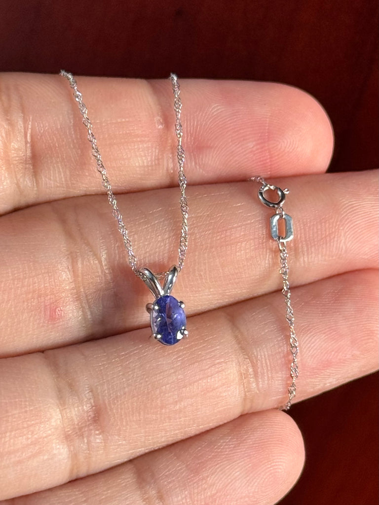 Celebrate the rare violet‑blue glow of Tanzanite in a refined everyday pendant. This AA‑grade oval Tanzanite (~6.5 x 4.5 mm; approx. 0.57–0.60 ct) is expertly prong‑set in platinum with graceful scroll details for a timeless solitaire look. Finished with an 18" 18K white gold Singapore chain that adds fluid sparkle and a luxurious drape. Elegant, versatile, and gift‑ready—perfect as a December birthstone necklace or a signature touch of color.