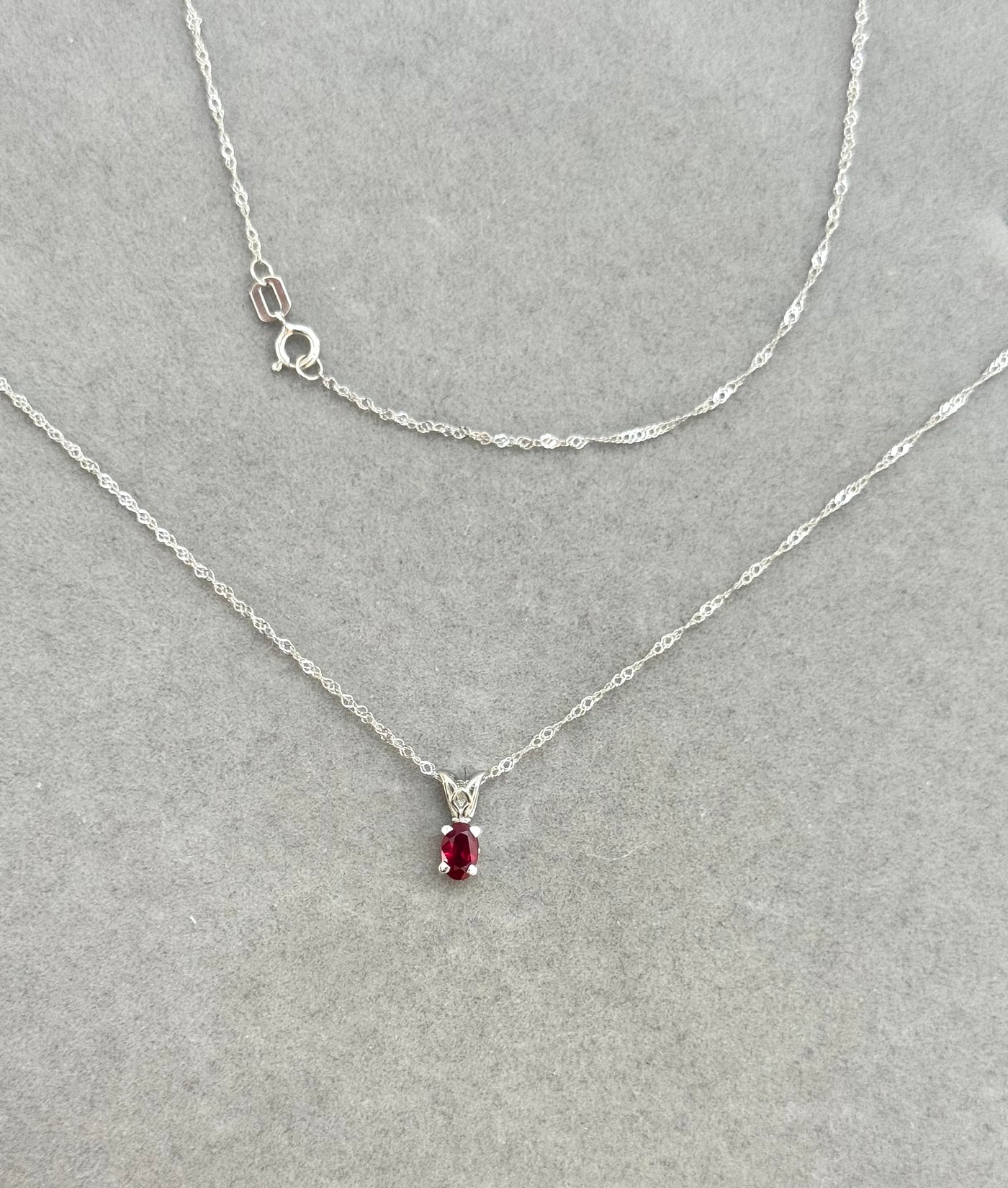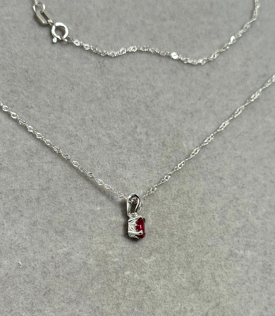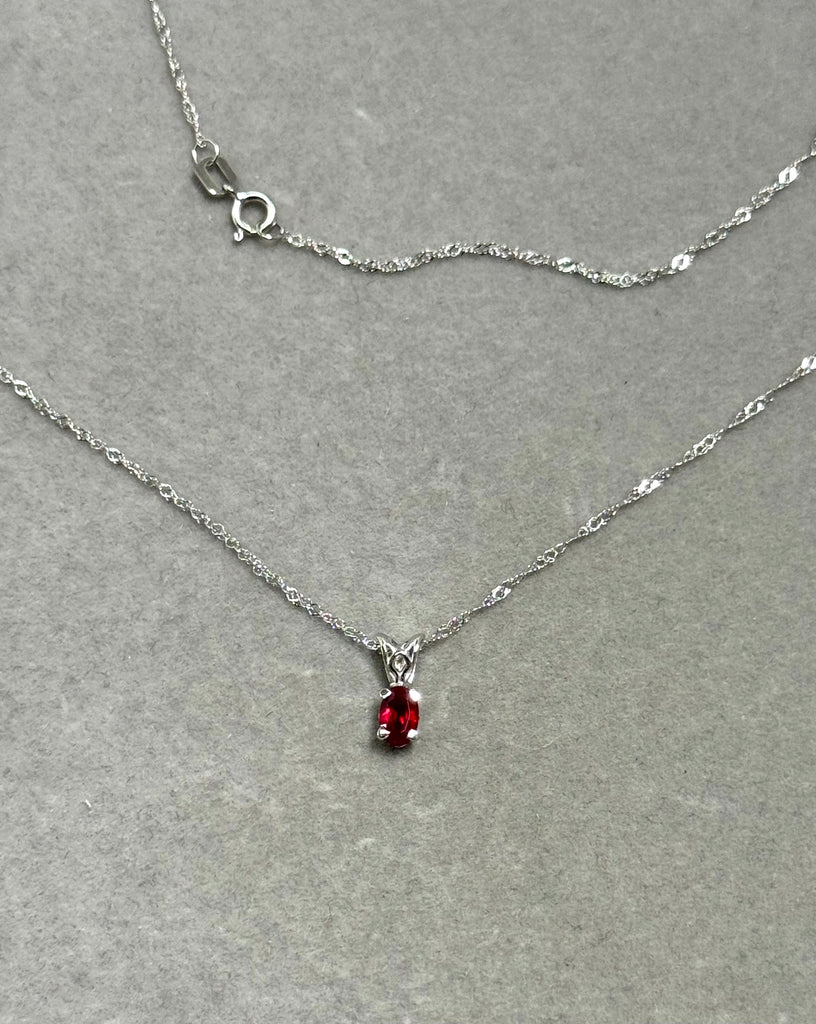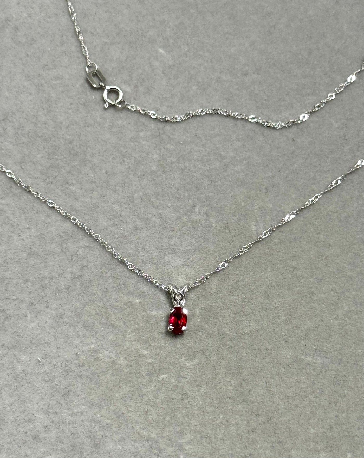 This dazzling **Ruby Scroll Pendant** showcases an **AA quality oval-cut ruby**, prong set in platinum. With an approximate gemstone weight of **0.25–0.40 carats**, it radiates a vivid pinkish-red hue, admired for its depth and elegance. Completed with an **18-inch 18K White Gold Singapore Chain**, this pendant combines timeless luxury with everyday versatility.