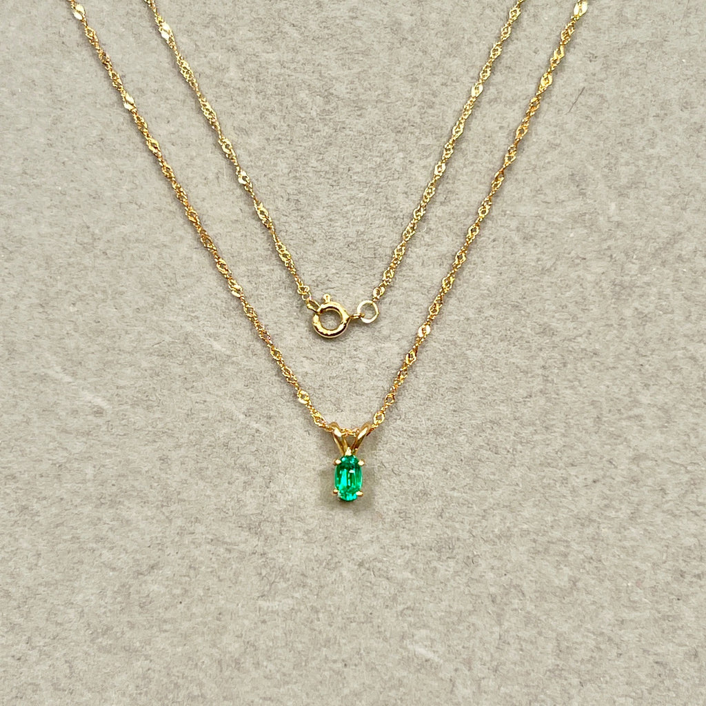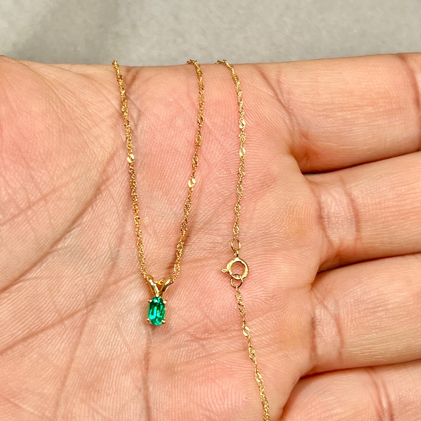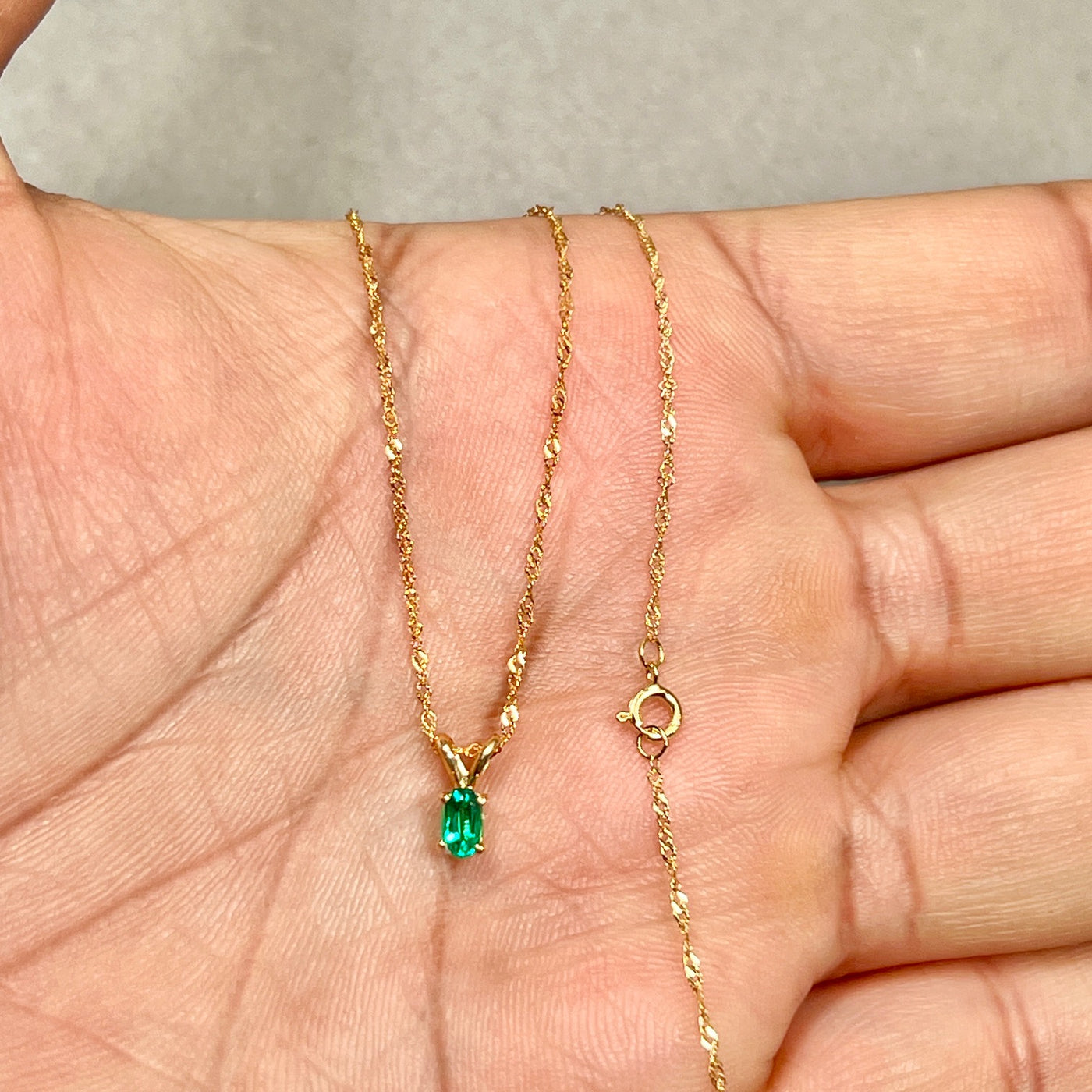 The lightweight carat range and compact stone size create a comfortable, balanced feel on the neckline. The Singapore chain adds subtle texture and fluid movement, while the polished yellow gold provides a warm contrast against the emerald’s green depth. The overall experience is quiet, stable, and refined rather than visually loud.