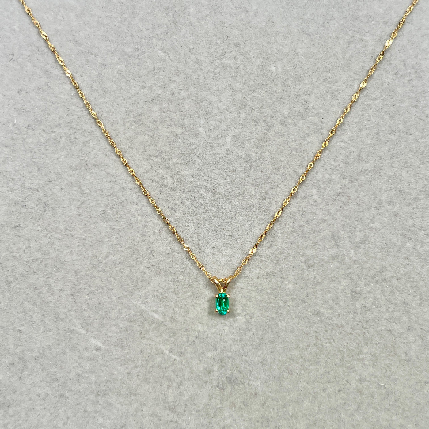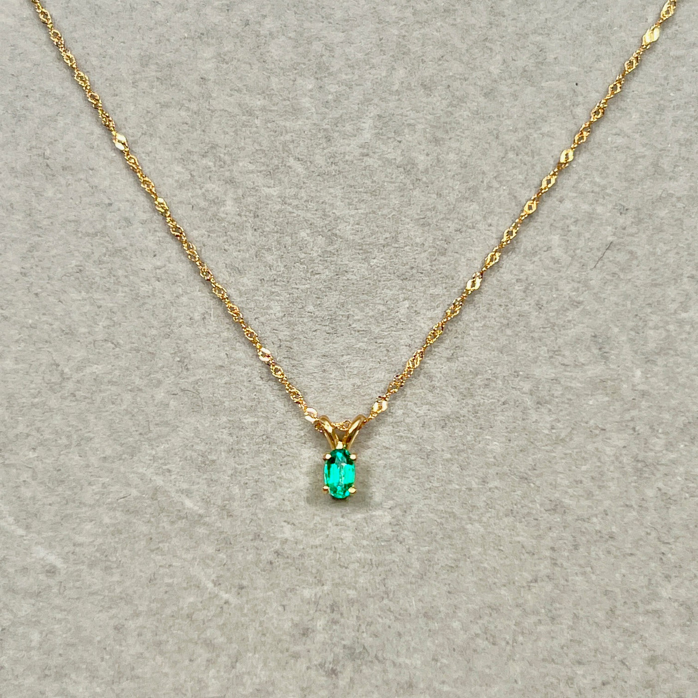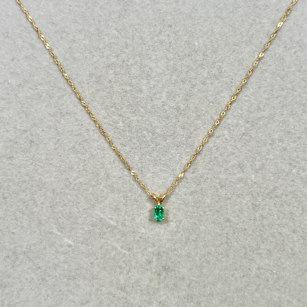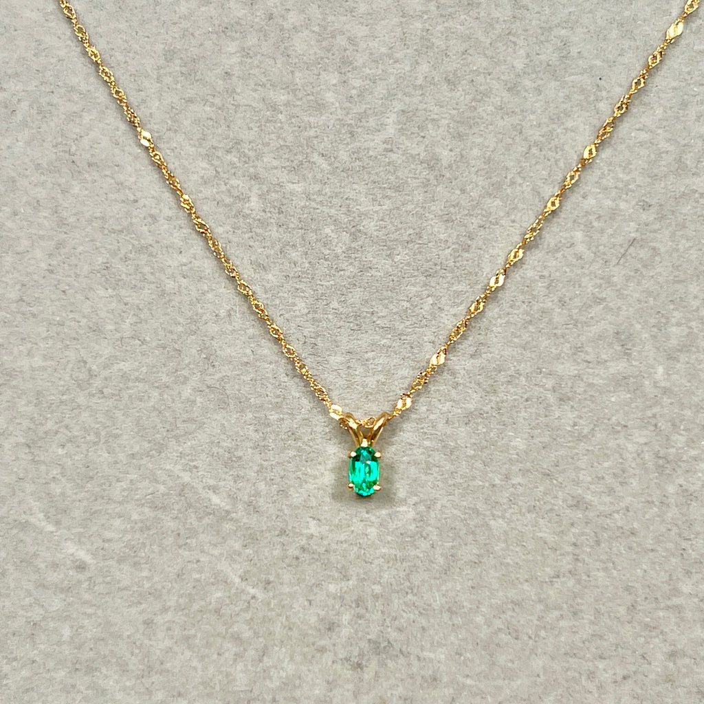 The lightweight carat range and compact stone size create a comfortable, balanced feel on the neckline. The Singapore chain adds subtle texture and fluid movement, while the polished yellow gold provides a warm contrast against the emerald’s green depth. The overall experience is quiet, stable, and refined rather than visually loud.