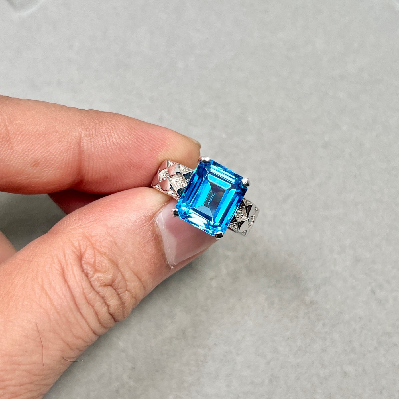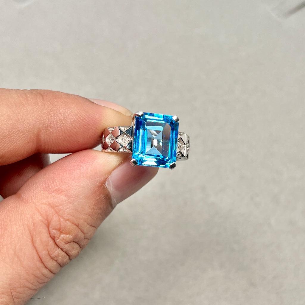Swiss blue topaz ring in 14K white gold showcases a bold emerald-cut gemstone with radiant brilliance.