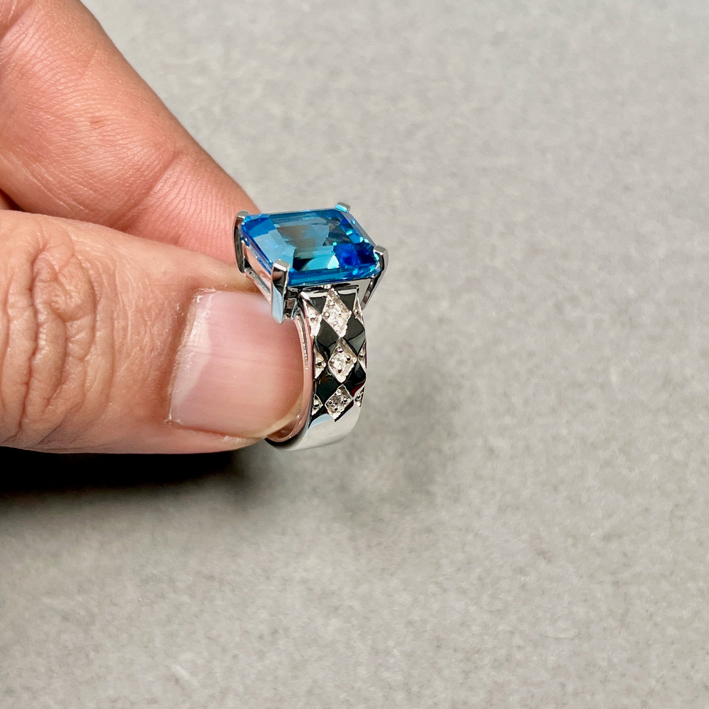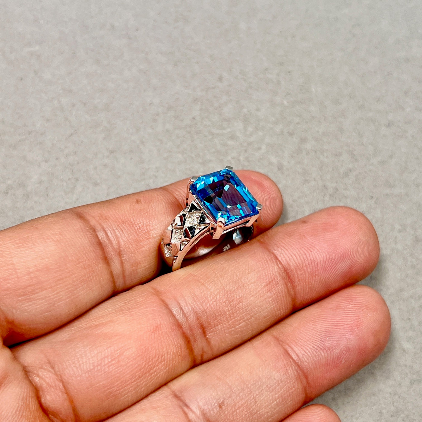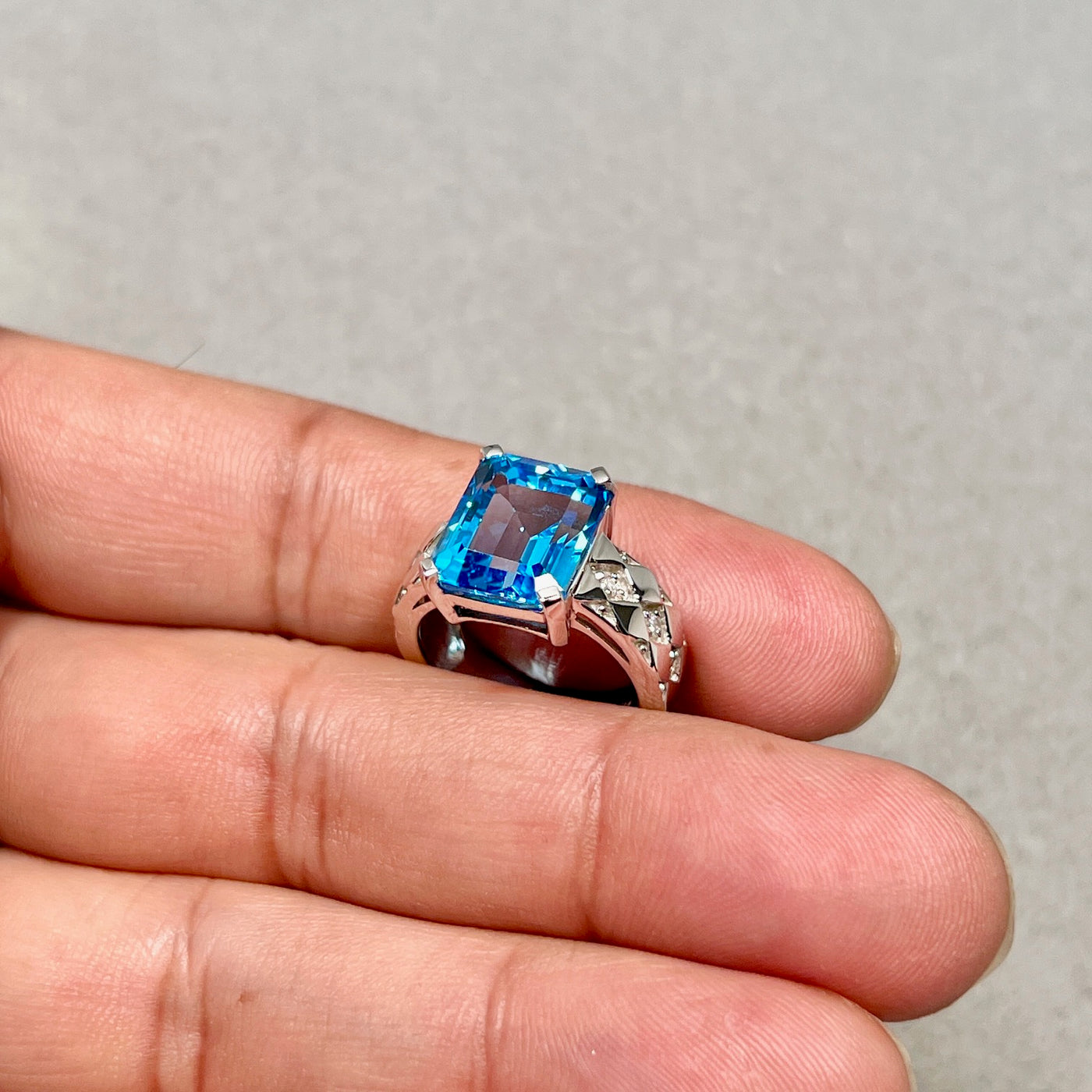 This eye-catching ring features a large 7.72 carat AAA quality Swiss blue topaz in a sleek emerald cut, known for its clean lines and mirror-like reflections. Accented with six sparkling diamonds, the design adds just the right touch of brilliance without overshadowing the center stone. Crafted in polished 14K white gold, this piece blends contemporary style with timeless appeal. Perfect for those who love bold, refined jewelry that makes a lasting impression.