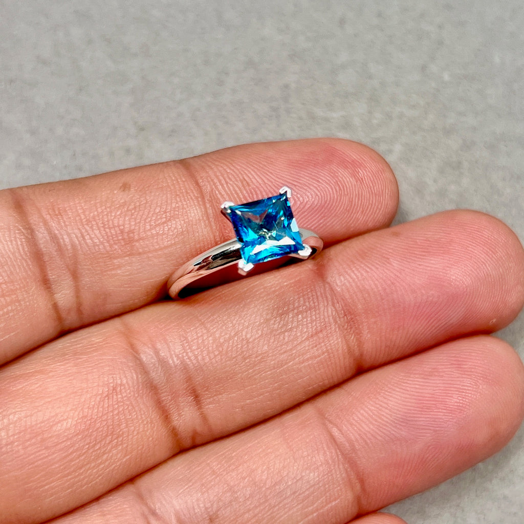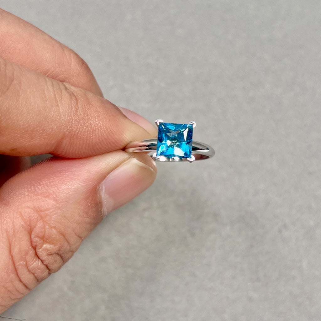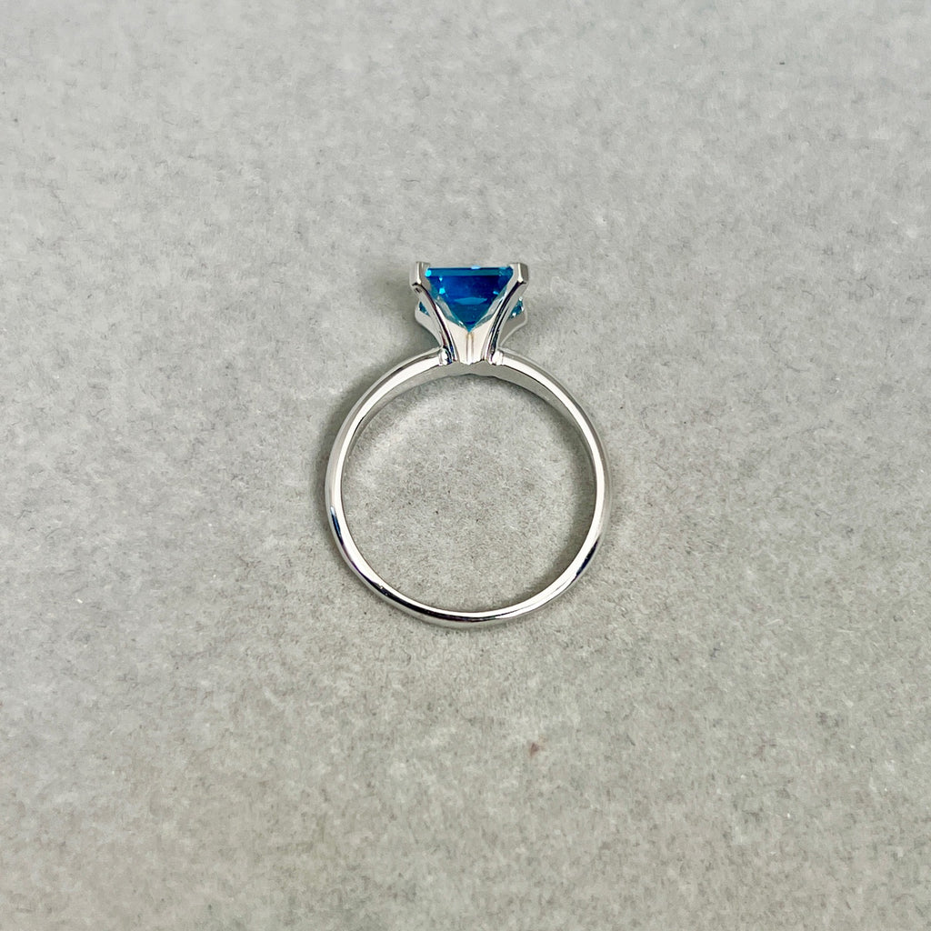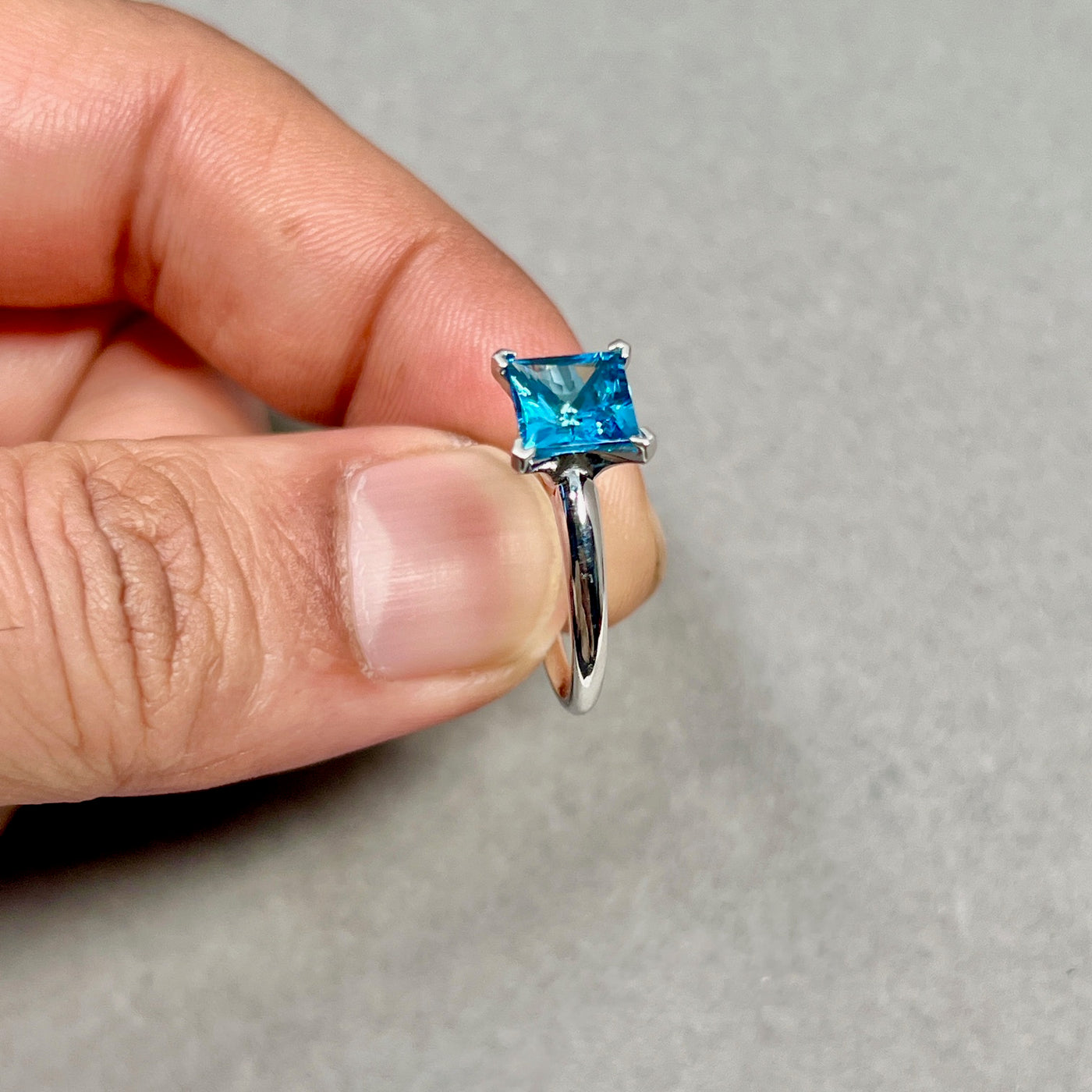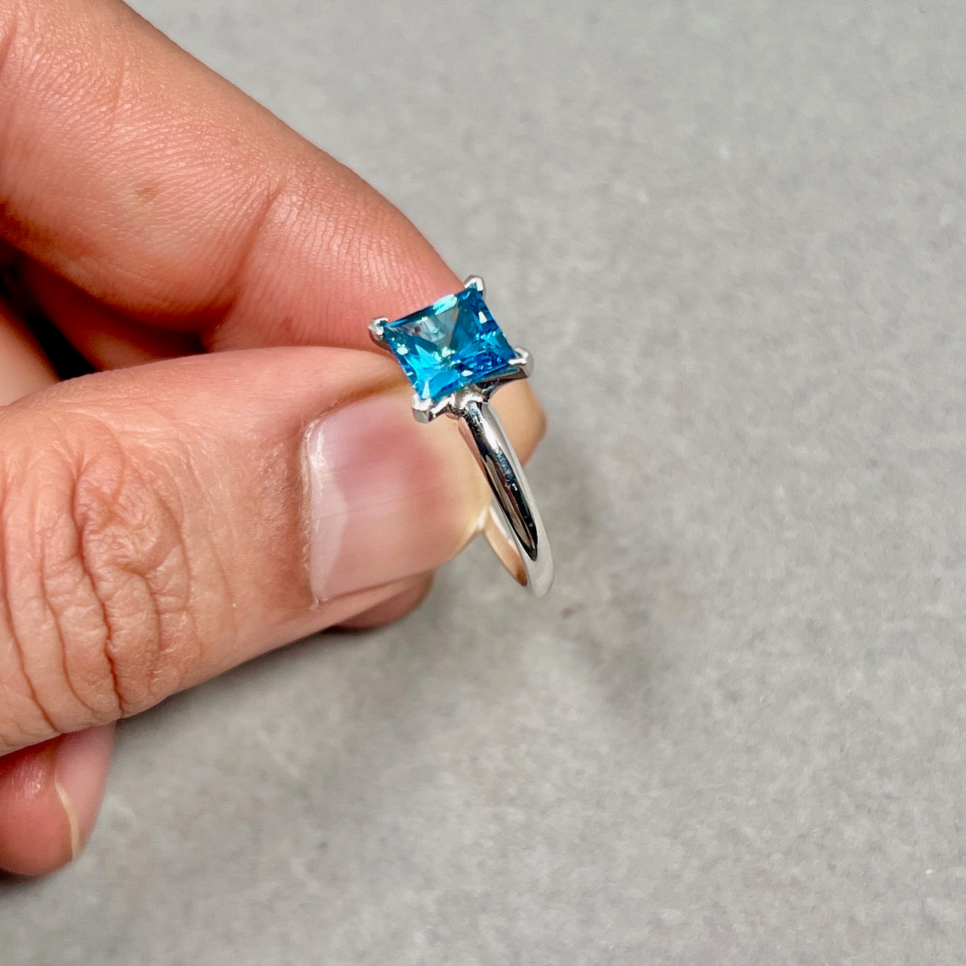 This elegant solitaire ring showcases a vivid Swiss blue topaz, precision cut in a princess shape to maximize sparkle and depth. The crisp geometry of the stone paired with polished white gold creates a modern yet timeless aesthetic.