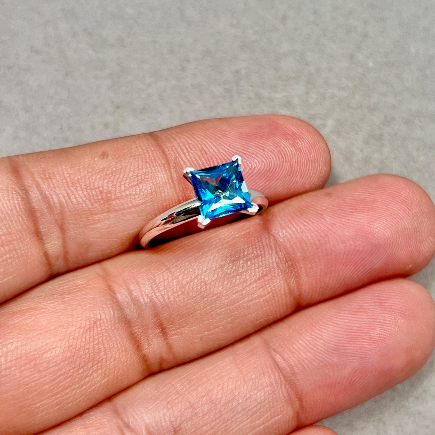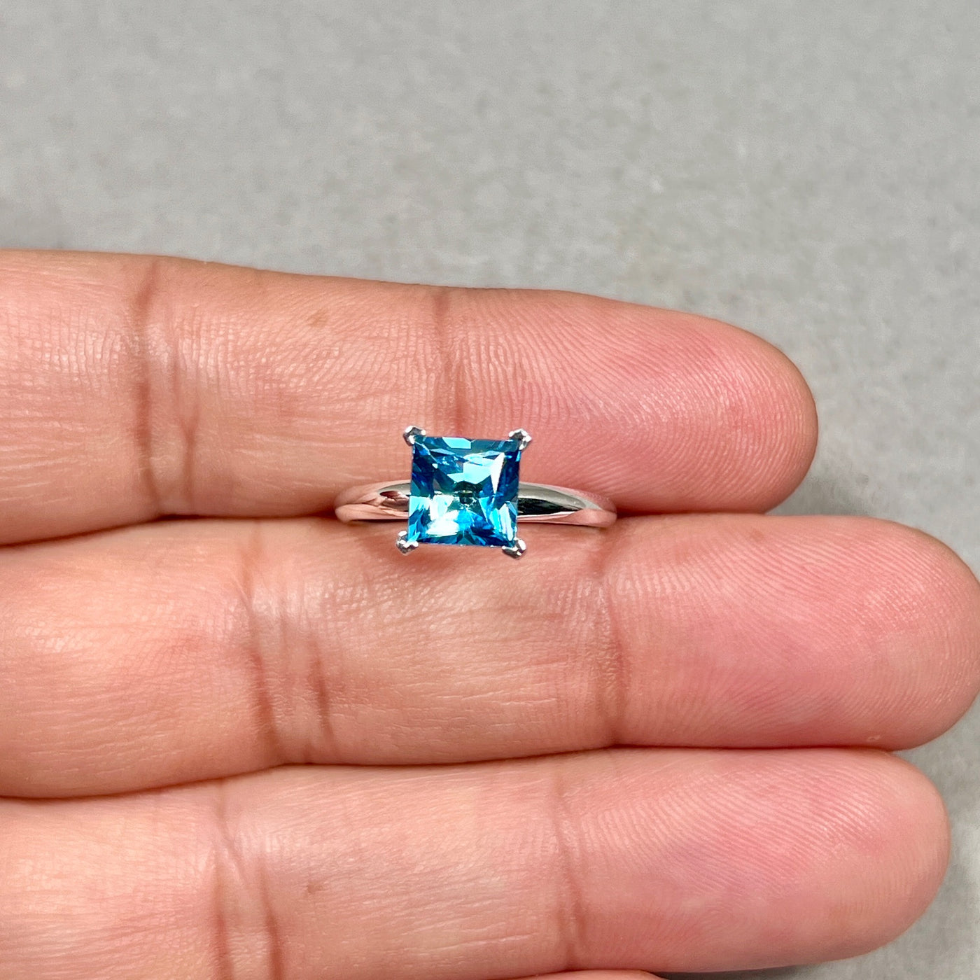 Swiss Blue Topaz Ring 7mm Princess Cut 14K White Gold, 2 Ct Solitaire Ring, Blue Gemstone Ring size 7.5
