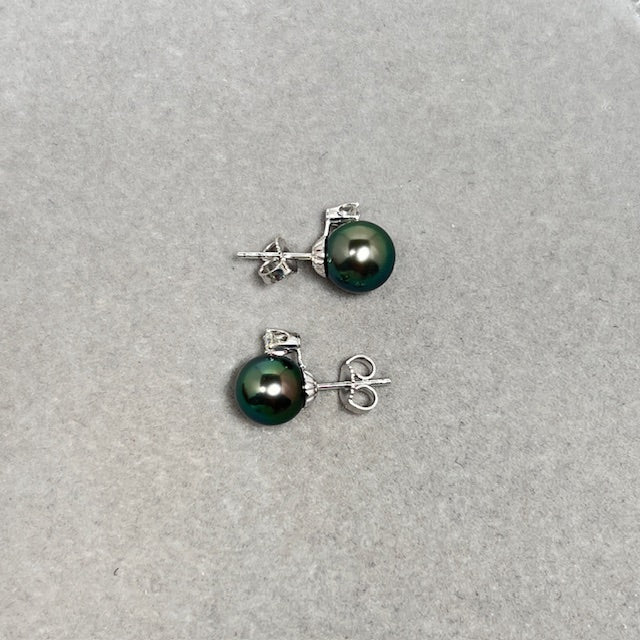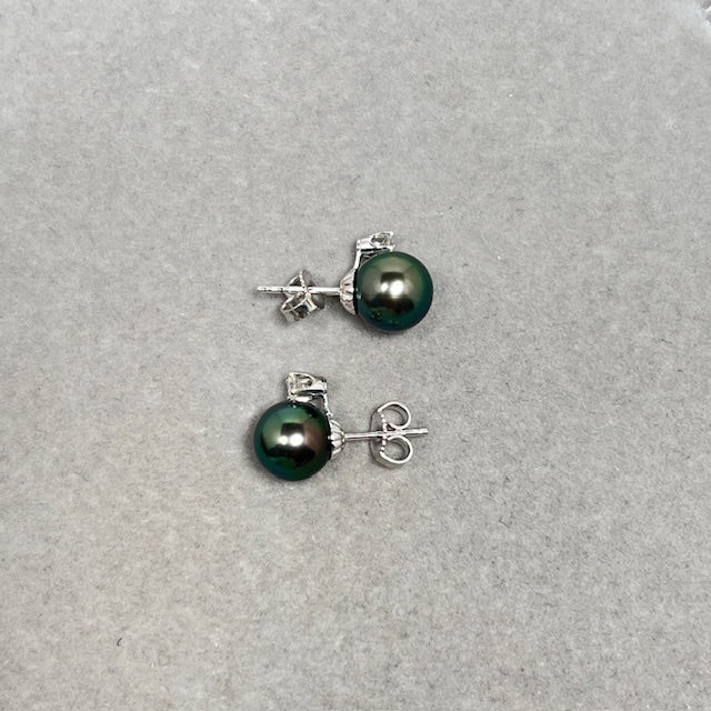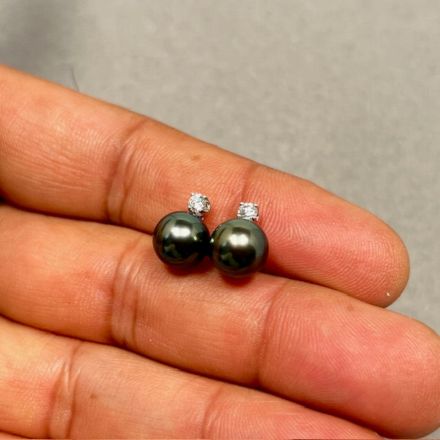 Tahitian Pearl & Diamond Earrings | 0.15 Ct Diamond 8mm Cultured Pearl | 18K White Gold Fine Jewelry | Elegant Gift for Her